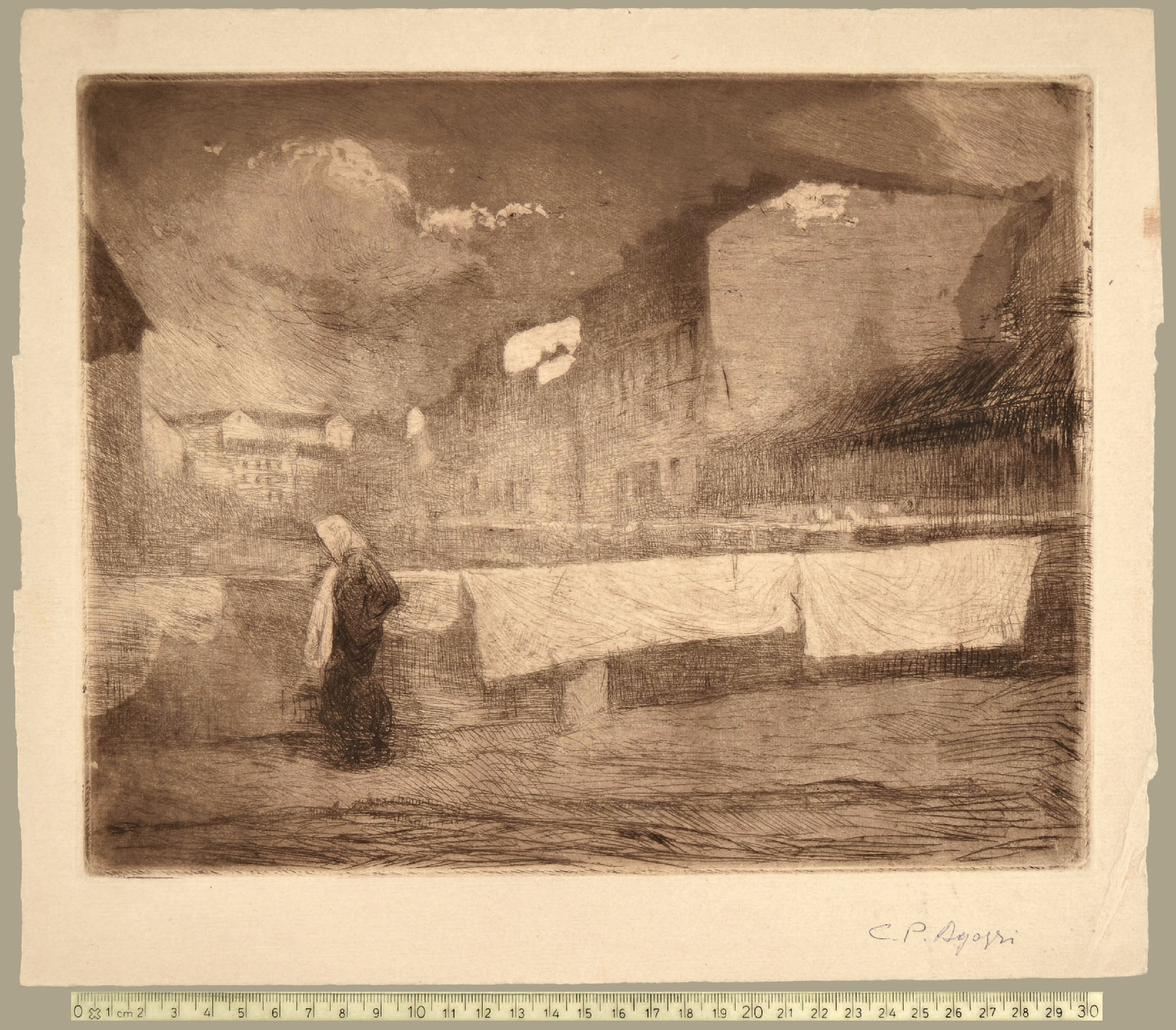 The painter Carlo Bellesia (Milan 1899 - 1973). At age 17, Bellesia, host of the male Orphanage of Milan (Martinitt), was hired as lithographer by Federico Marioni (Claro 1866 - Milan 1938). Marioni, himself an etcher, opened in Milan, in the last decade of the nineteenth century, a chalcographic atelier attended by many prominent artists as Conconi, Feragutti-Visconti, Russolo, Boccioni, Wildt, Grubicy, Agazzi, Ernesto Bazzaro. The activity of Bellesia at the Marioni atelier, allowed him to gather a collection of etchings by those artists.