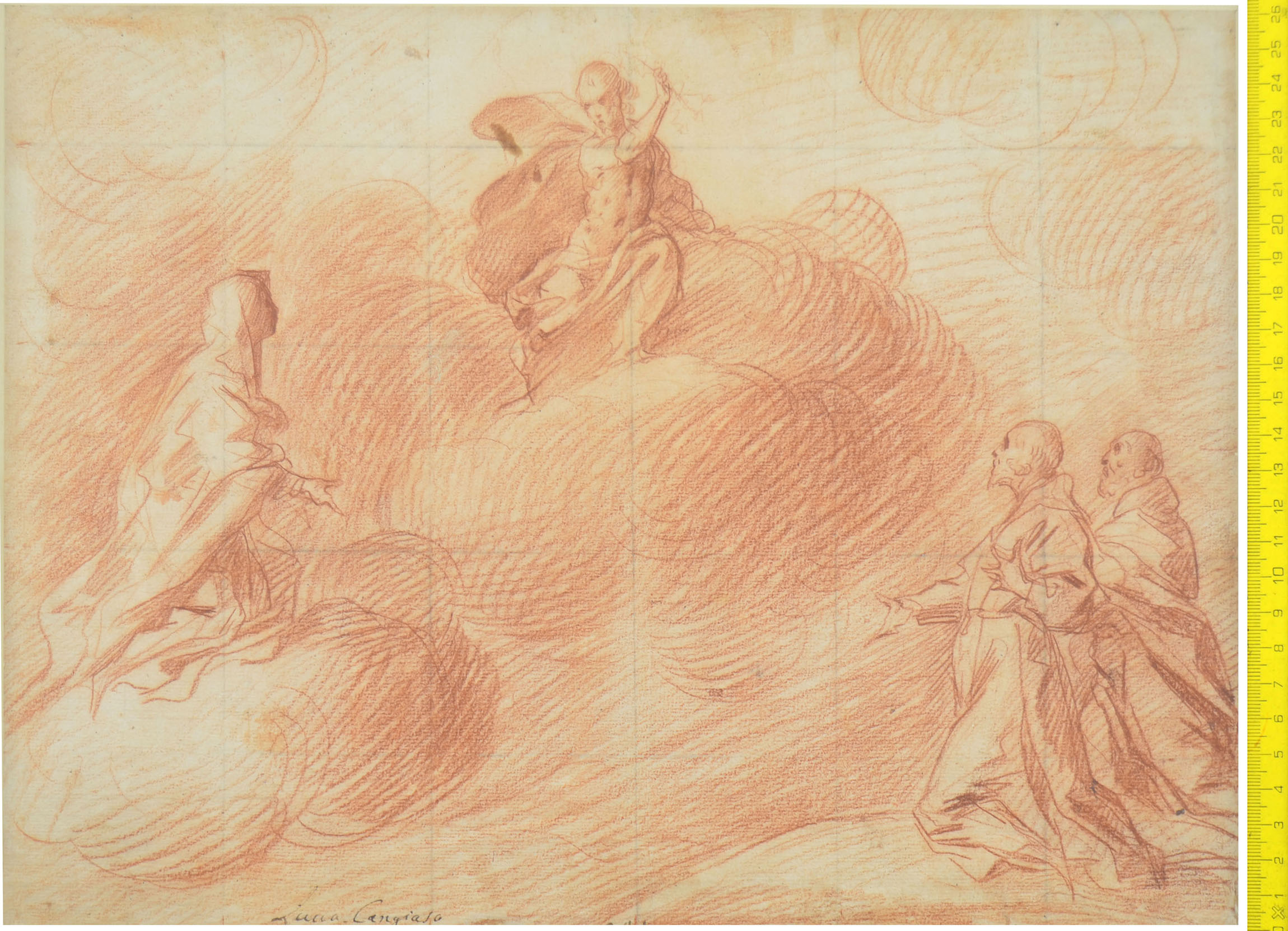 Red chalk, squared in black chalk. Inscribed in pen at bottom Luca Cangiaso. Unidentified watermark. 260 x 305 mm.