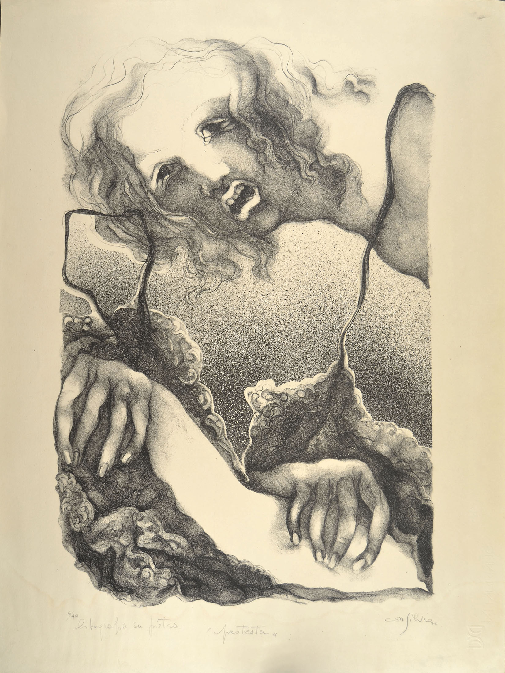 Lithograph, numbered, inscribed, titled, signed and dated in pencil bottom margin 6/40 litografia su pietra "protesta" Consilvio 76.