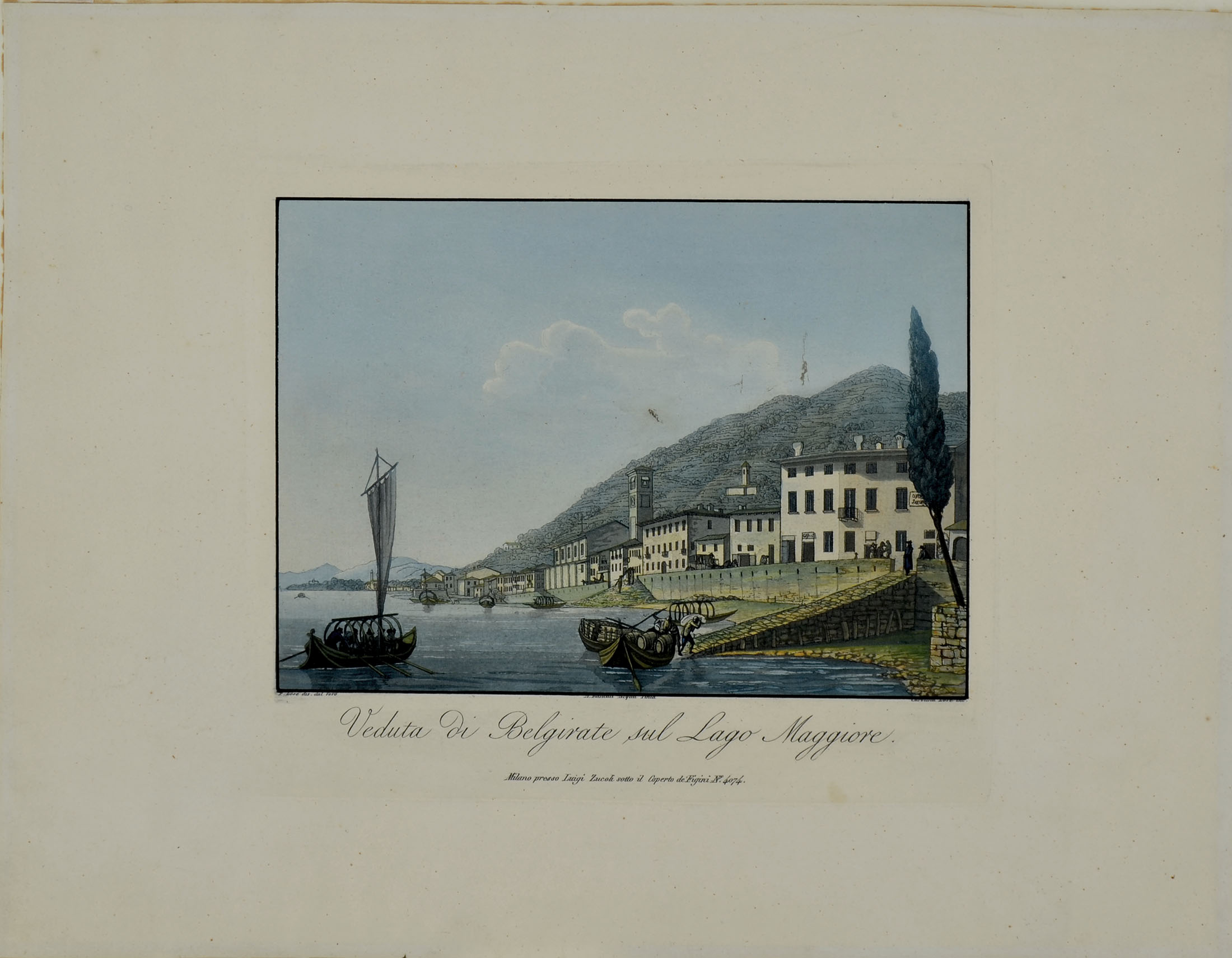 Etching and aquatint, hand coloured, after Federico Lose. From the series Viaggio Pittorico e Storico ai tre laghi Maggiore, di Lugano e Como col corso del fiume Adda e Ticino. From the second edition (1830) published by Luigi Zucoli. To the platemark 198 x 230 mm. The full sheet 295 x 385.