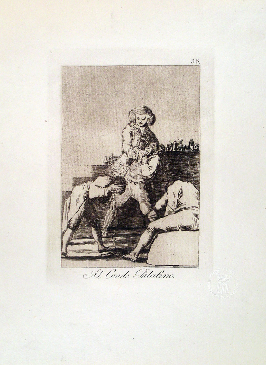 Etching, aquatint, drypoint and burin, plate 33 from Los Caprichos (1797-98); Harris 68, III, 11. An impression from the eleventh edition (1929), limited to 100 copies, printed in sepia ink on laid paper. With the blind stamp of the Calcografia Nacional. With margins, generally in very good condition. To the platemark 210 x 147 mm, the entire sheet measuring 335 x 252 mm.