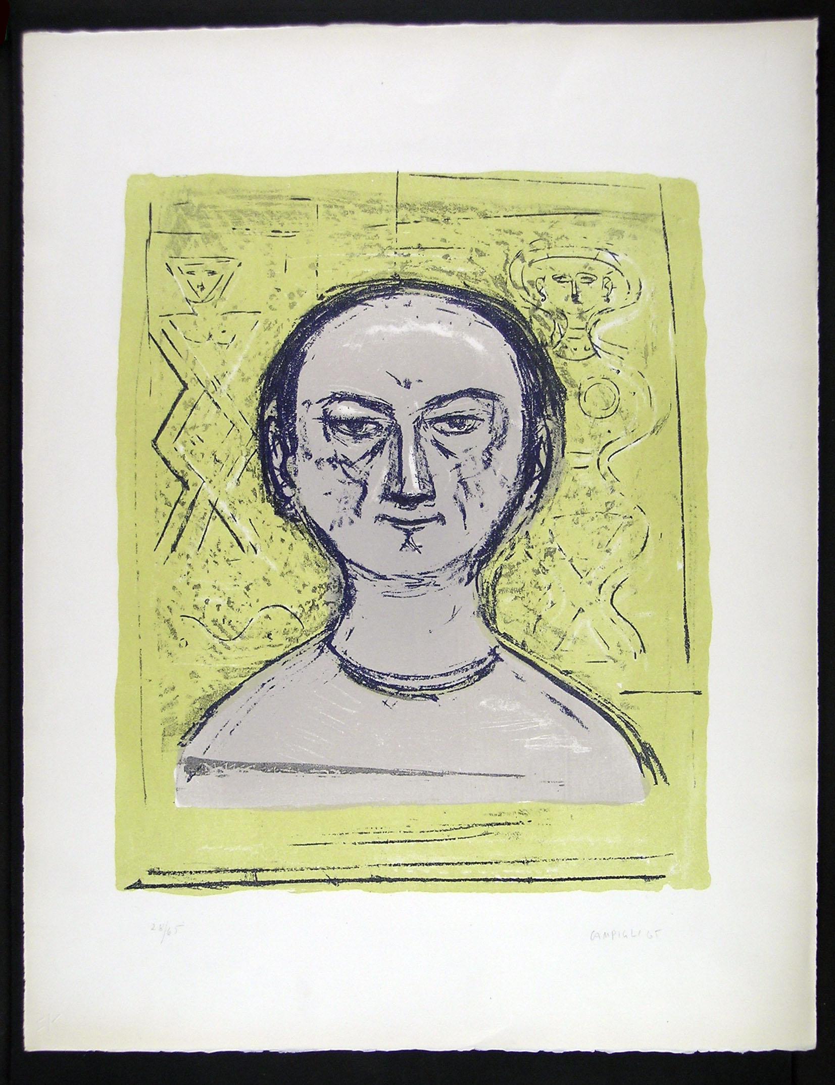 Colour lithograph, 1965, from Europaische Graphik IV, published by Galerie Ketterer, Munich, in an edition of 65 with arabic numerals on Rives paper and XXXV with roman letters on Japanese paper. Meloni-Tavola 196. Signed in pencil CAMPIGLI and numbered 28/65. On Rives. With the Ketterer blind stamp. Lightly toned at the edges, otherwise in good condition. The lithographic area 455 x 375 mm, the entire sheet measuring 650 x 505 mm.