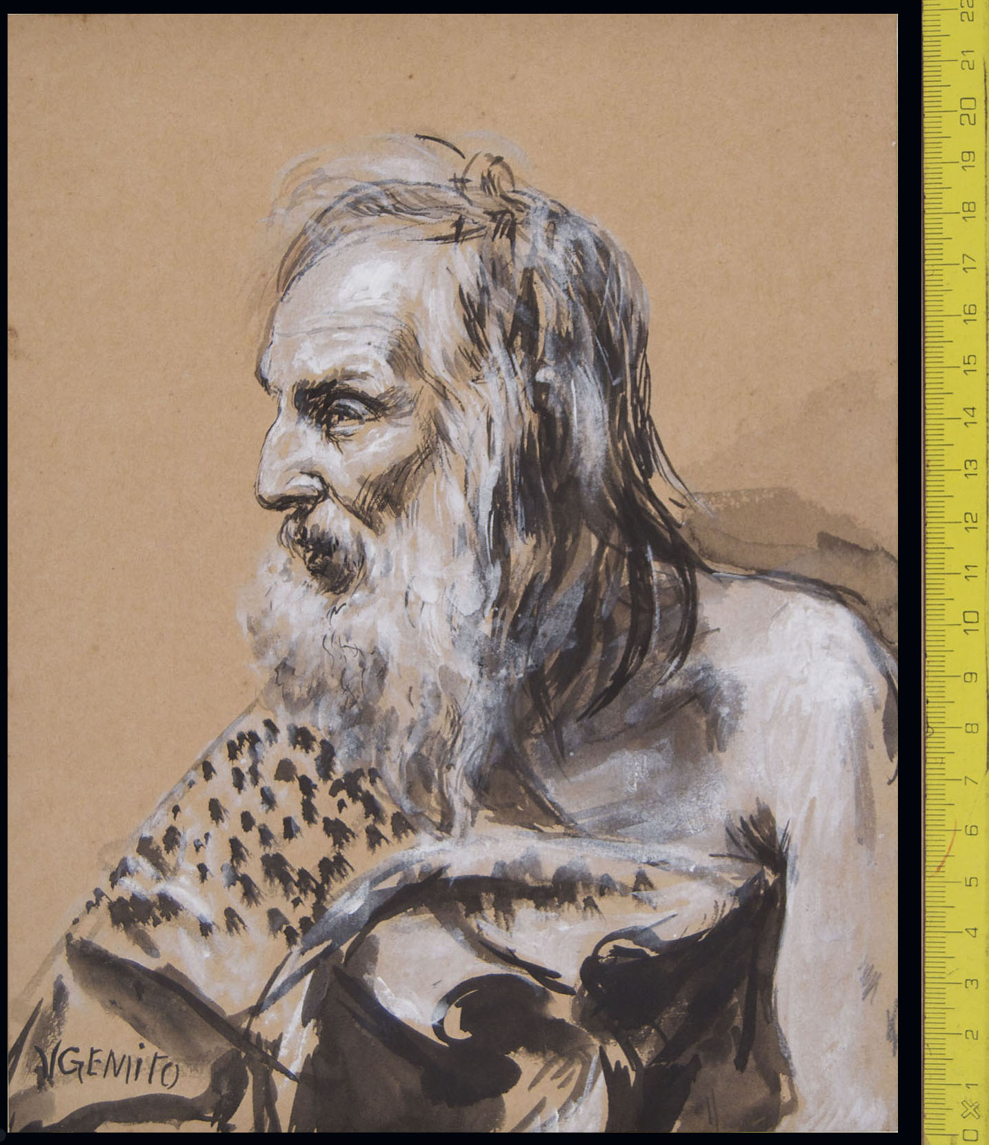 This drawing, unpublished, relates to a pair of sculptures and two drawings. The two sculptures, both dated 1914, have been published in 1944; see A. Schettini, E. Somaré, Vincenzo Gemito, 1944; tav. 45 and 46. The current location of these works is unknown to me. Both sculptures, a original wax and a bronze, portray Masto Ciccio, Gemito's adoptive father, respectively as an allegory of Time and as an allegory of Winter Two other drawings related with the pair of sculptures and depicting Masto Ciccio as an allegory of Winter have been quite recently published in the catalogue of the Gemito exhibition in Villa Pignatelli, Naples, see D. M. Pagano, Gemito, Naples 2009, cat. no 42, p. 151. These two drawings are dated 1913 and 1914. The same dating we propose for our drawing.