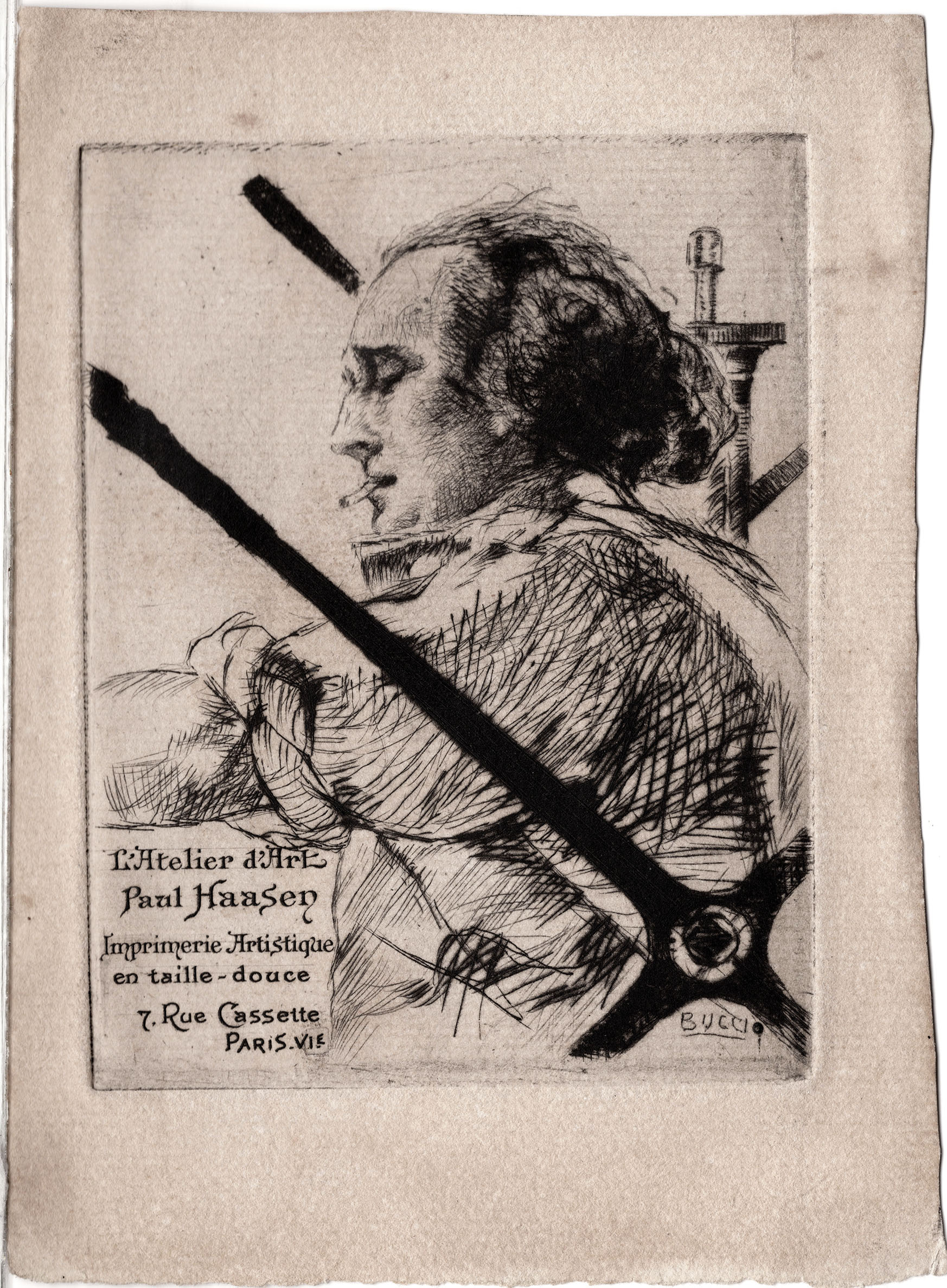 Drypoint, 98 x 75 mm. Signed Bucci in the plate. A very good impression, printed on laid paper. This is the final state. See here on my website an impression of the earlier state, before the Haasen’s address.