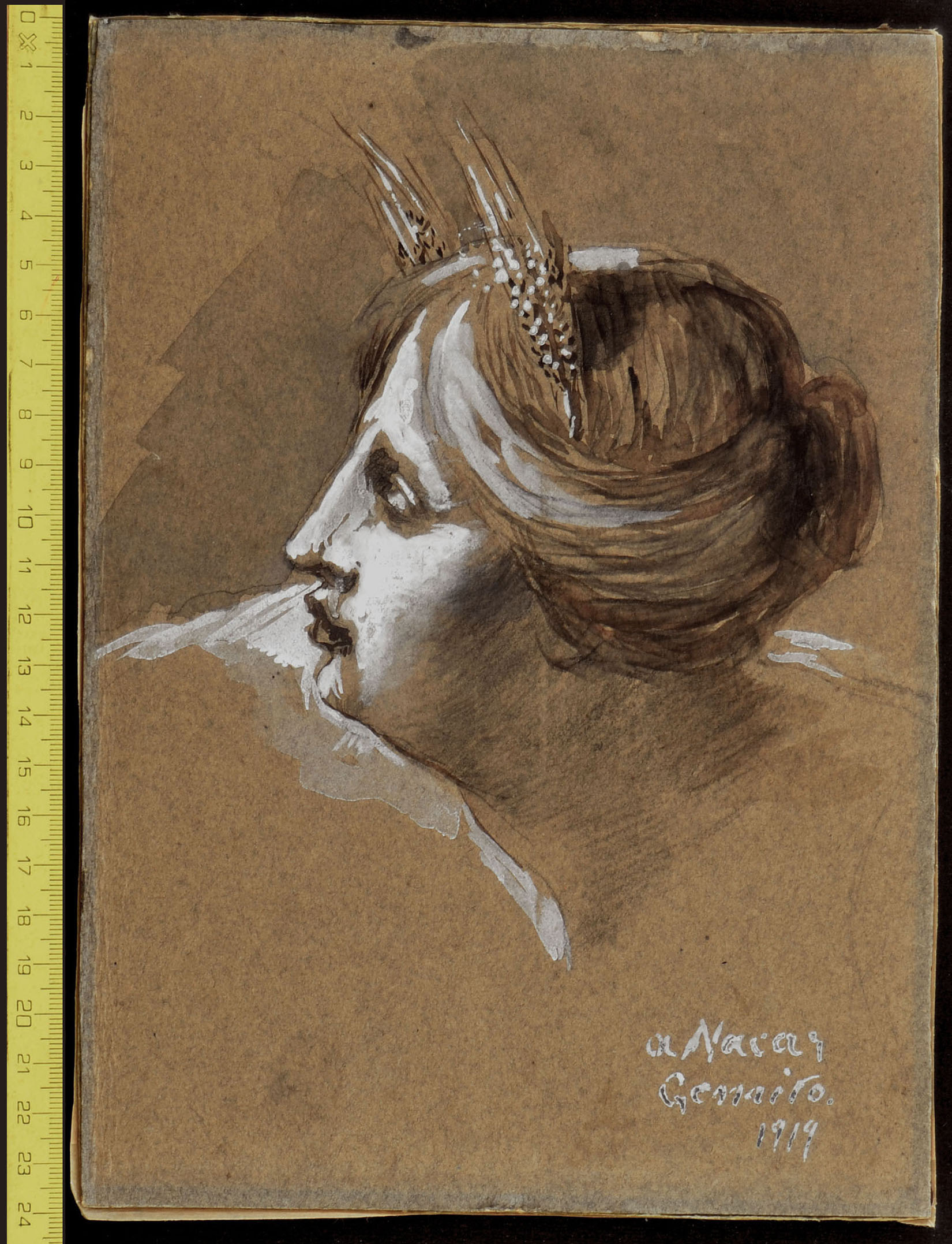 Brush with brown and gray ink, heightened with white lead, over traces in black chalk. Drawn on a thick brownish cardboard. Dedicated, signed and dated in white lead a Nara (?) / Gemito / 1919; 240 x 171 mm.