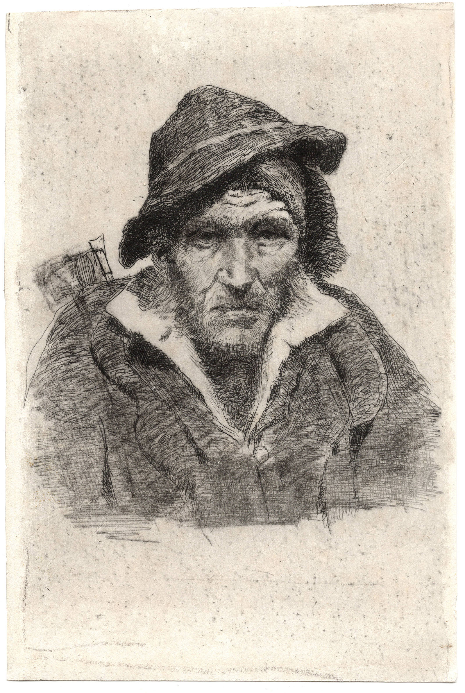 The etching, unsigned, is very rare. It reproduces, in reverse, the painting by Dell'Orto Vecchio Contadino (ca 1880). For the painting see F. Monteforte, Uberto Dell'Orto e il Realismo Lombardo del secondo Ottocento, Rome 1992; colour illustration no. 20. Mezzetti, at no. 300 of her catalogue, mentions, with the title Lo spaccalegna, an  impression in the Ambrosiana Library, but with different dimensions. This specimen is not present today in the Library. However, an example of the etching is reproduced in the monograph dedicated to Dell'orto in 1921 by R. Calzini.