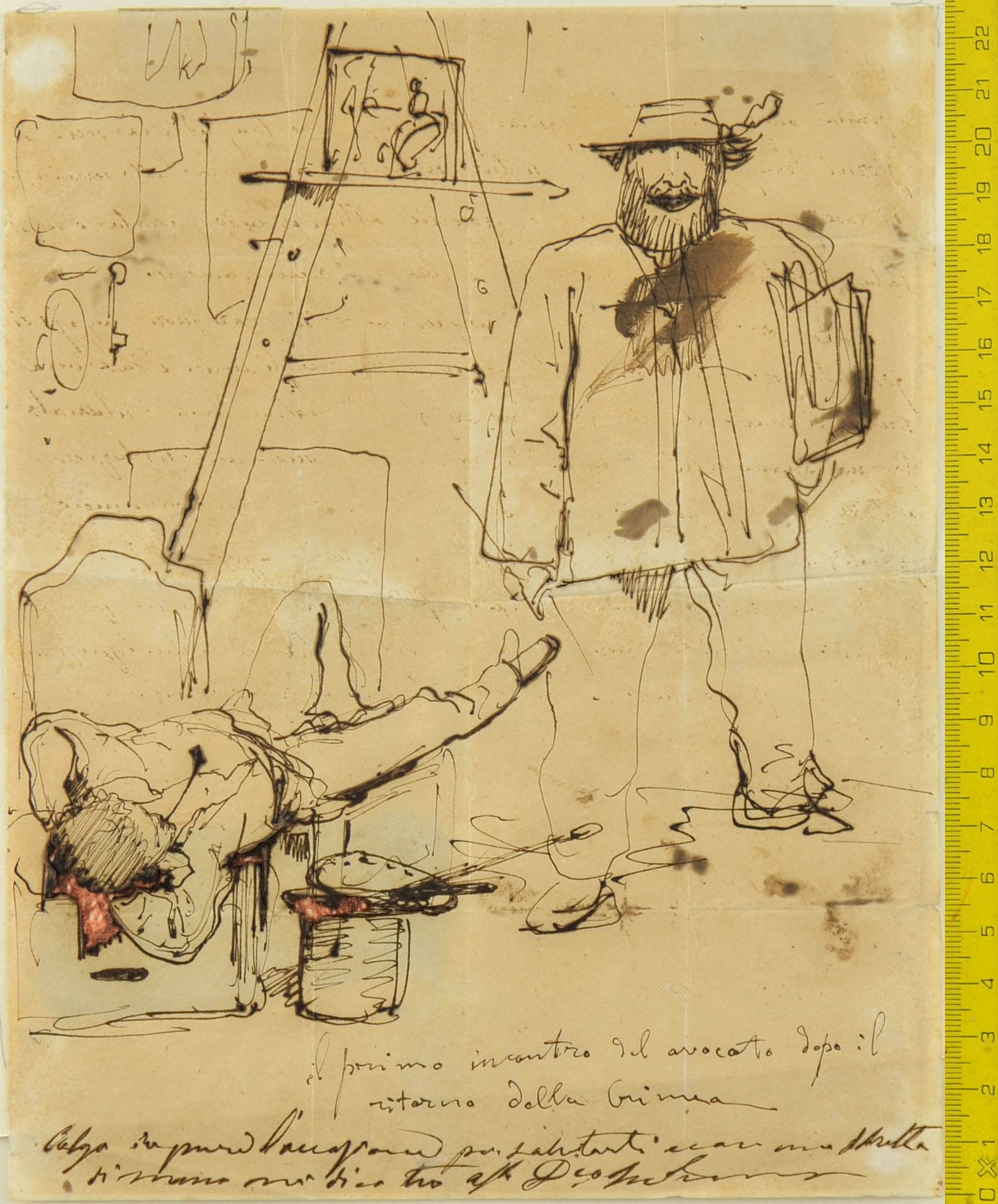 Pen with brown ink. Inscribed in pen Il primo incontro del avvocato dopo il / ritorno dalla Crimea. Dedicated and signed Colgo da prima l'occasione per salutarti con una stretta / di mano mi dico tuo aff.e D.co Induno. 227 x 173 mm.