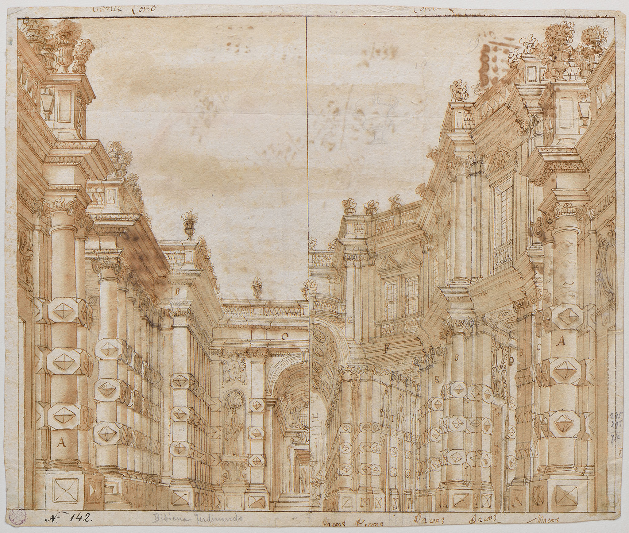 Italy produced a number of families of theatrical designers, among whom were the Galliari of Turin and the Quaglio of North Italy who worked in Austria and southern Germany. The earliest were the Bibienas, who created a new iconography for the stage and spread their style across Europe. The first member of the family to enter the art world is Giovanni Maria Galli da Bibbiena called il Vecchio (1618-1665), a painter, pupil of Francesco Albani. His two male sons Ferdinando (1657-1743) and Francesco (1659-1739) are the first artists of the family to deal with theater sets. The same did Ferdinando’s sons, Alessandro (1686-1748), Giuseppe (1695-1757), Antonio (1697-1774), and Giovanni Maria the younger; Francesco’s son Giovanni Carlo (1717-1760); and Giuseppe’s son Carlo (1721-1787). This family of prolific artists worked so closely with one another that it is often difficult for modern eyes to distinguish each artist’s work.