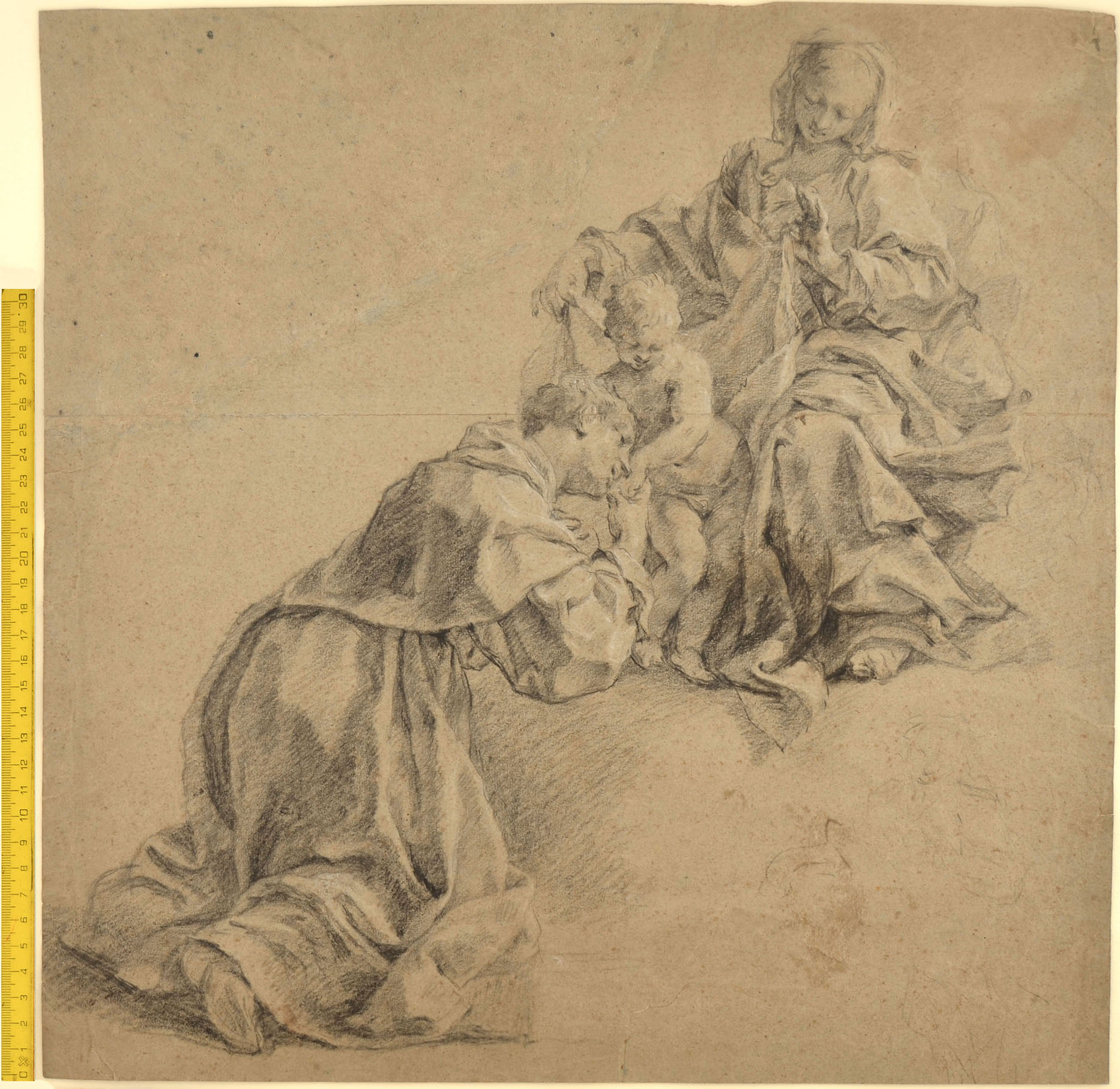 Black chalk on brownish paper; top left corner made up. 419 x 419 mm.