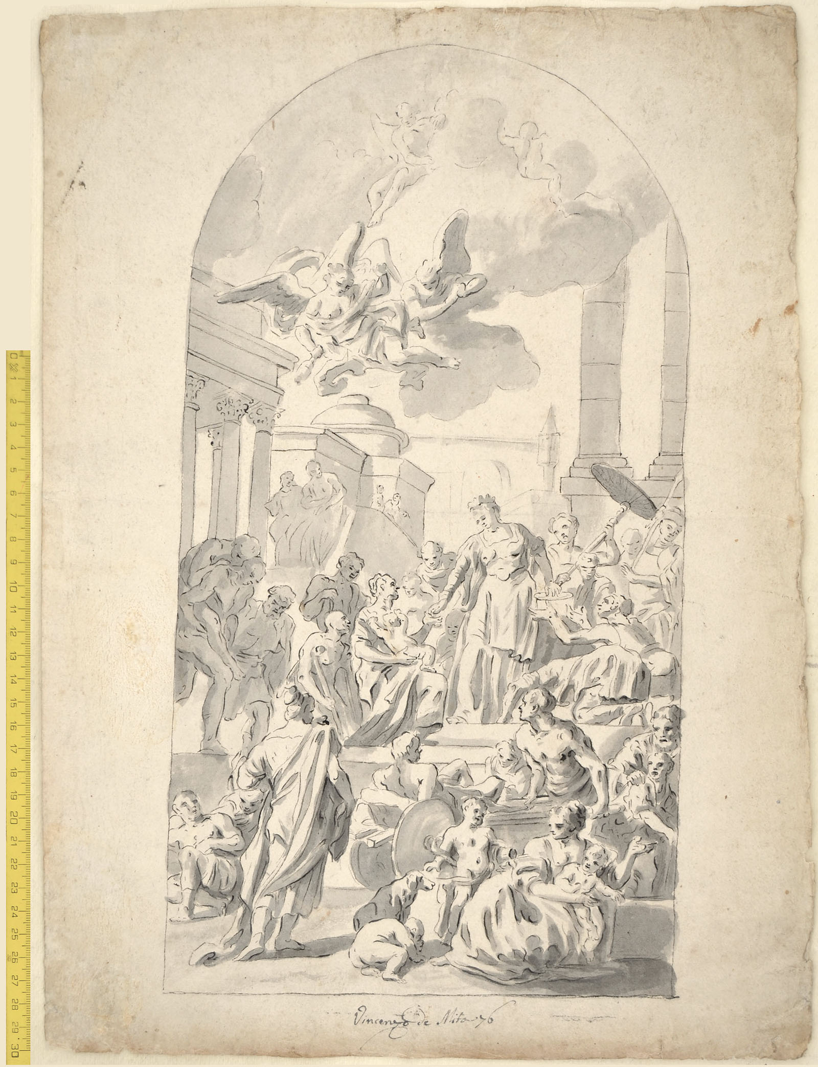 We do not know examples of De Mita's draughtsmanship, but it is very likely that this drawing, certainly connected to an altarpiece and strongly influenced by Solimena and De Mura, is an original work by Il Foggiano.