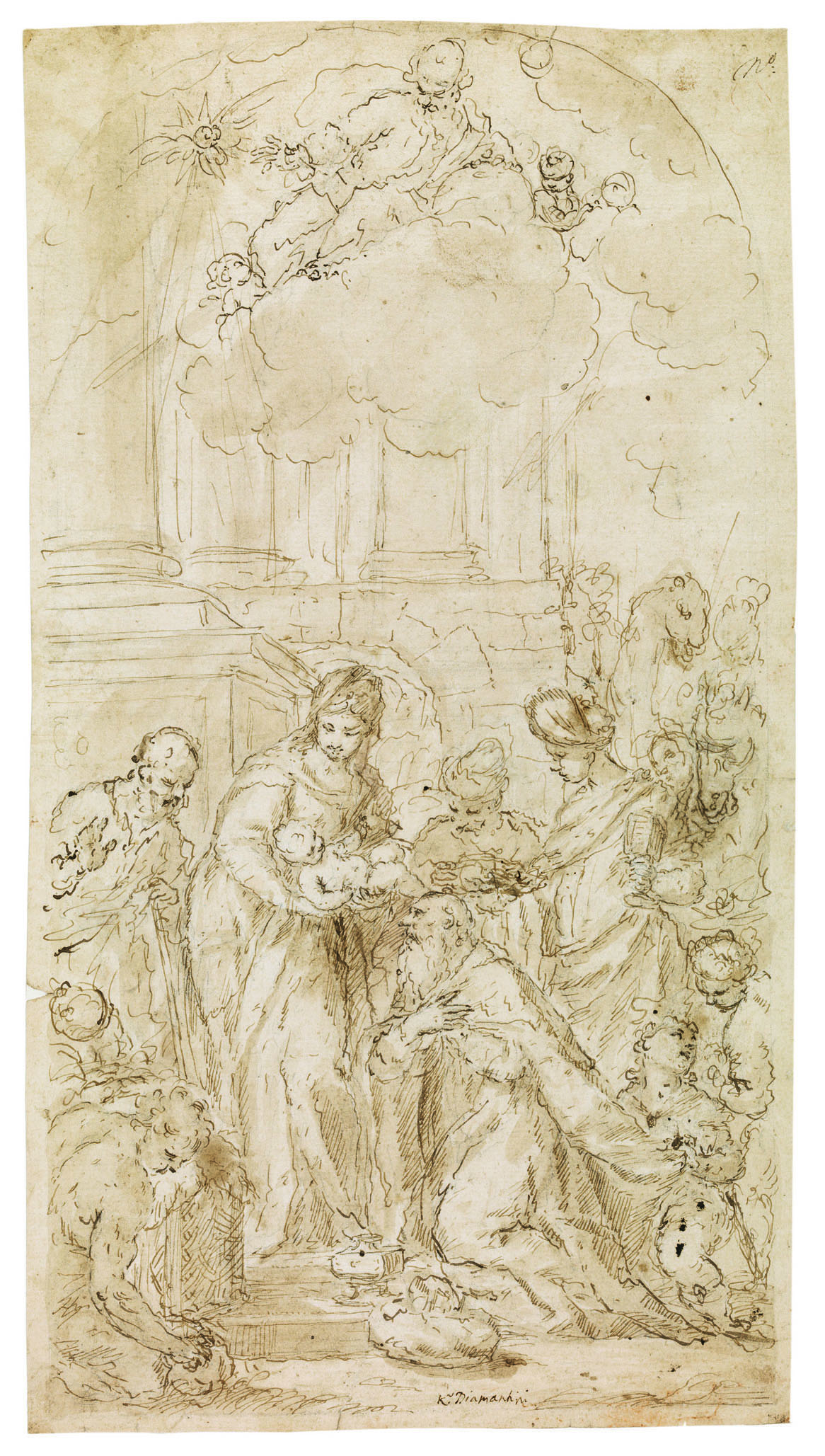 Pen and brown ink, brown wash. Inscribed in pen Kr Diamantini. 420 x 229 mm. This large drawing is preparatory for the altarpiece painted by Diamantini in the church of San Moisé, Venice.