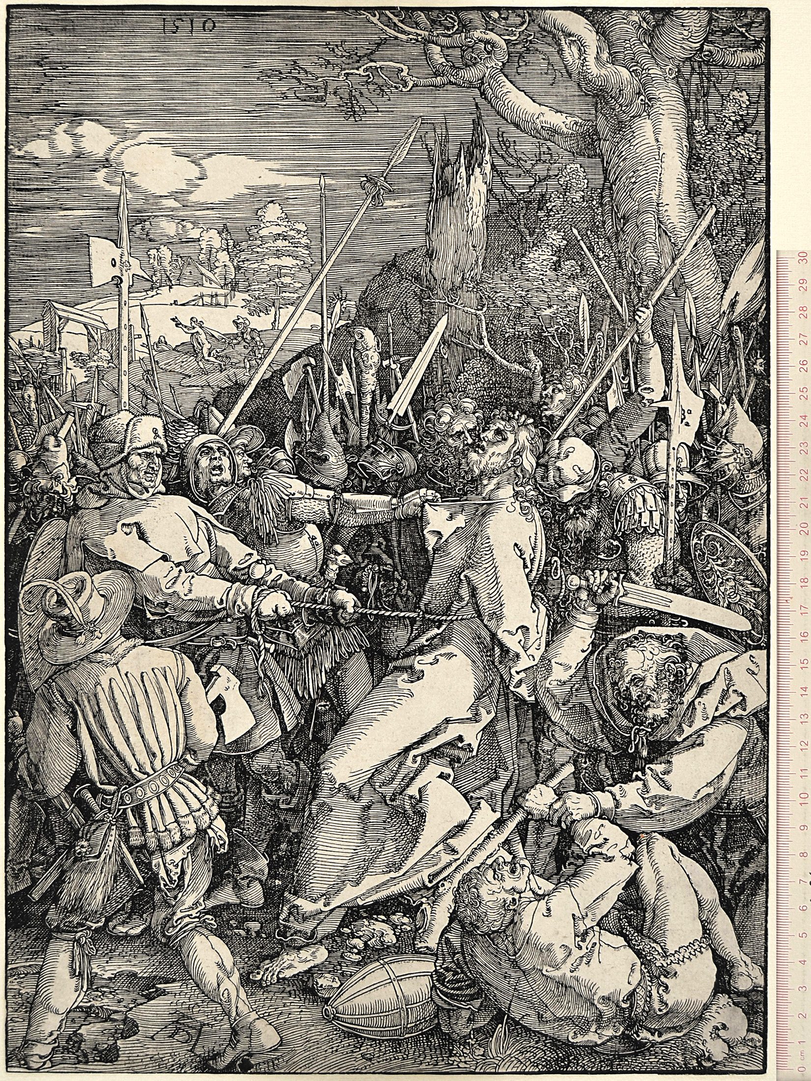 Woodcut, 1510, from the Large Passion. A fine impression in black ink on ivory laid paper, before text. Bartsch 7, Meder 116, Strauss 149.