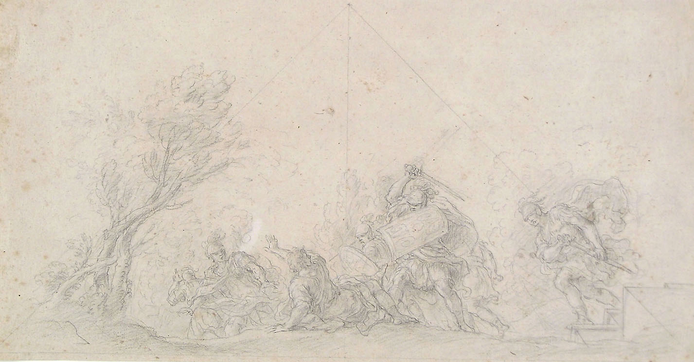 Black chalk, on light grey paper; 210 x 404 mm. The drawing perhaps represents the martyrdom of a saint or a scene from ancient mythology.