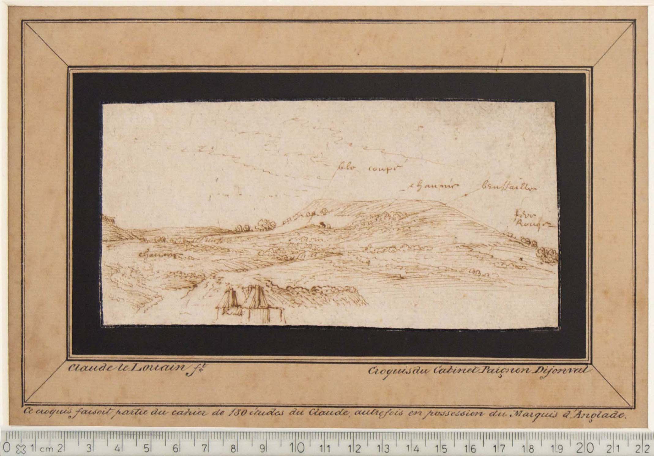 PROVENANCE: mounted on a cardboard of the cabinet Paignon-Dijonval (1708-1792) with an attribution to Claude Lorrain. According to the Paignon-Dijonval inscription the previous owner of the sketch was the Marquis d’Anglade. At the bottom right corner of the drawing there is an embossed collector mark which I am not able to identify.
