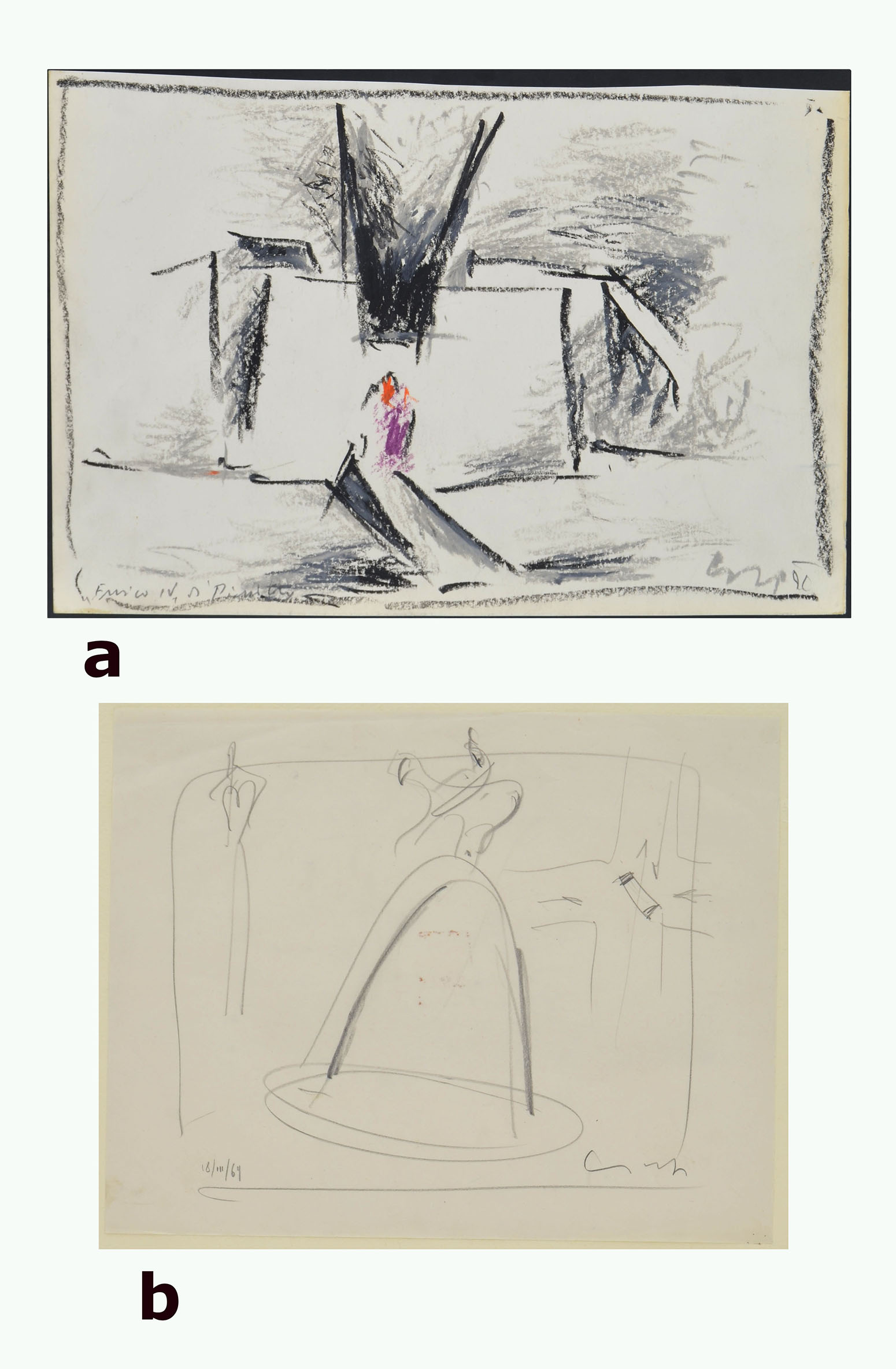 a) Set design study for Pirandello's Enrico IV, held in New York in 1944. Pencil, charcoal and wax crayons on cardboard. 230 x 345 mm. Signed lower right and titled lower left.