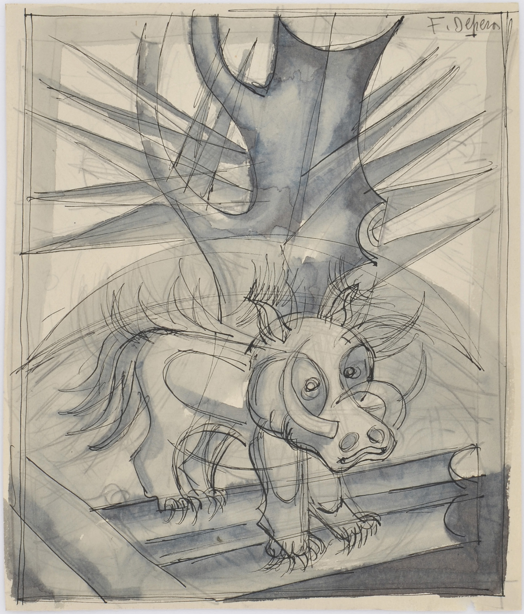 Pen and black ink, washed with blue gray ink. Signed F. Depero top right corner. 230 x 195 mm.