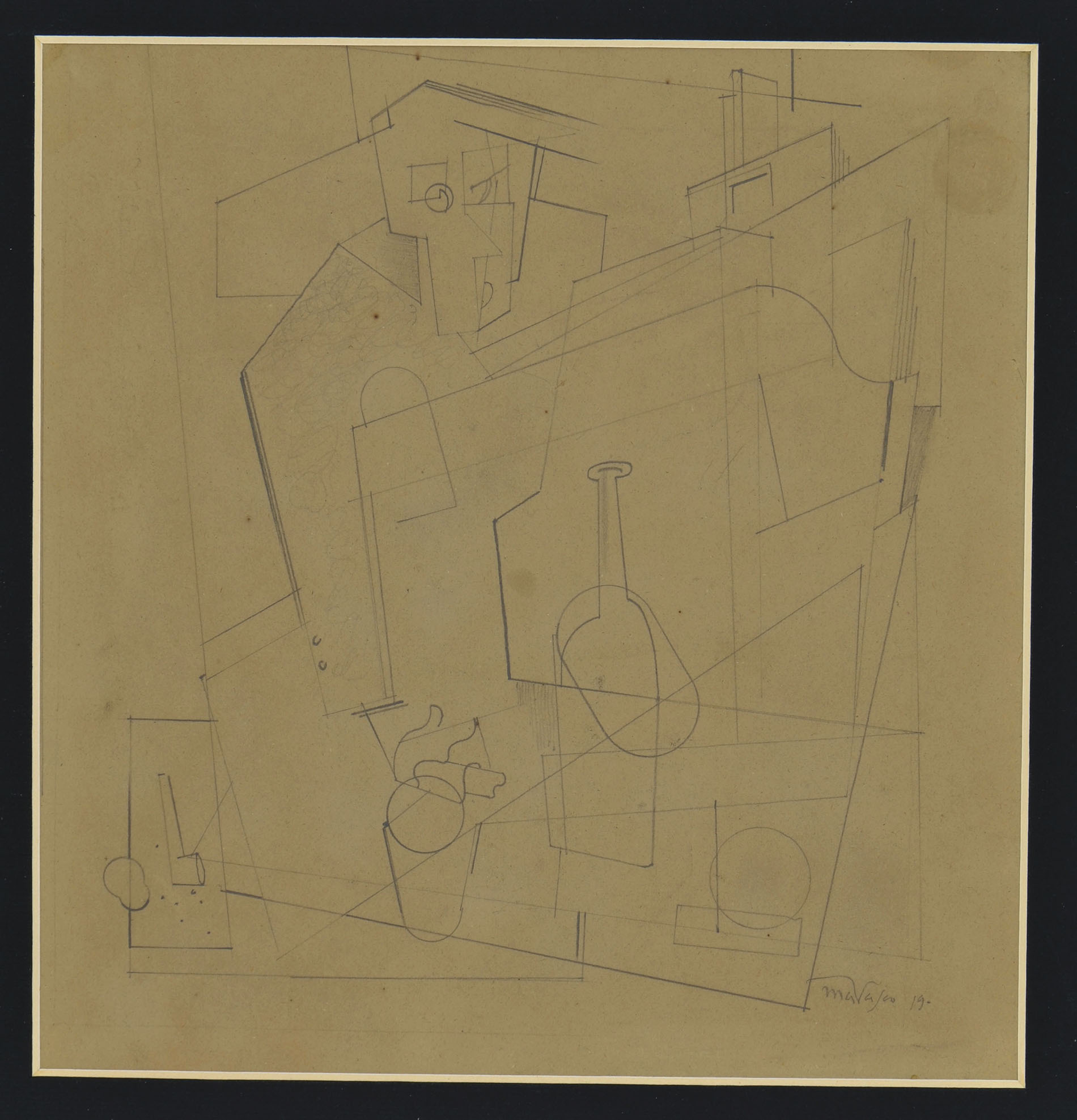 Black chalk, on grey paper; signed and dated Marasco 19 bottom right corner. 258 x 245 mm.