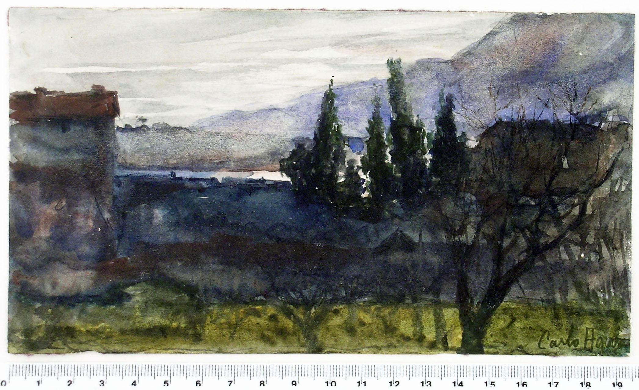 Watercolour. Signed Carlo Agazzi at bottom right; 108 x 195 mm.
