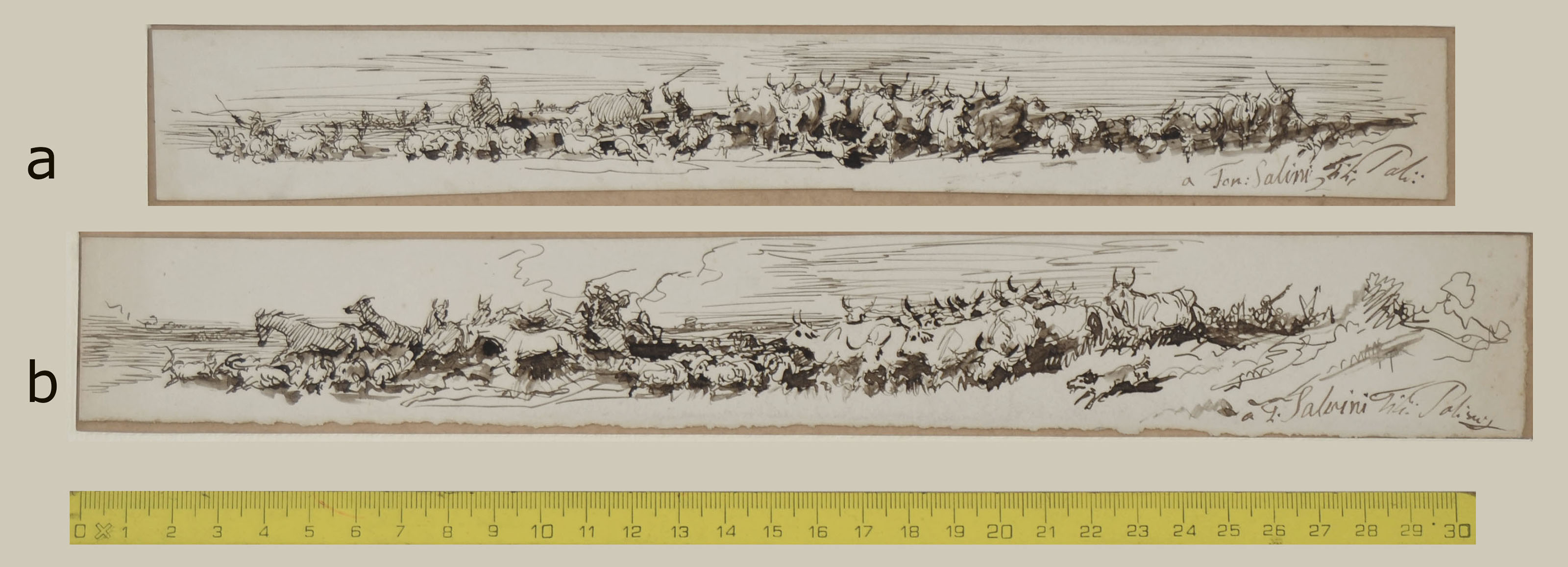 Two drawings in pen and brown ink. Both signed and dedicated to T. Salvini (probably the actor and patriot Tommaso Salvini)