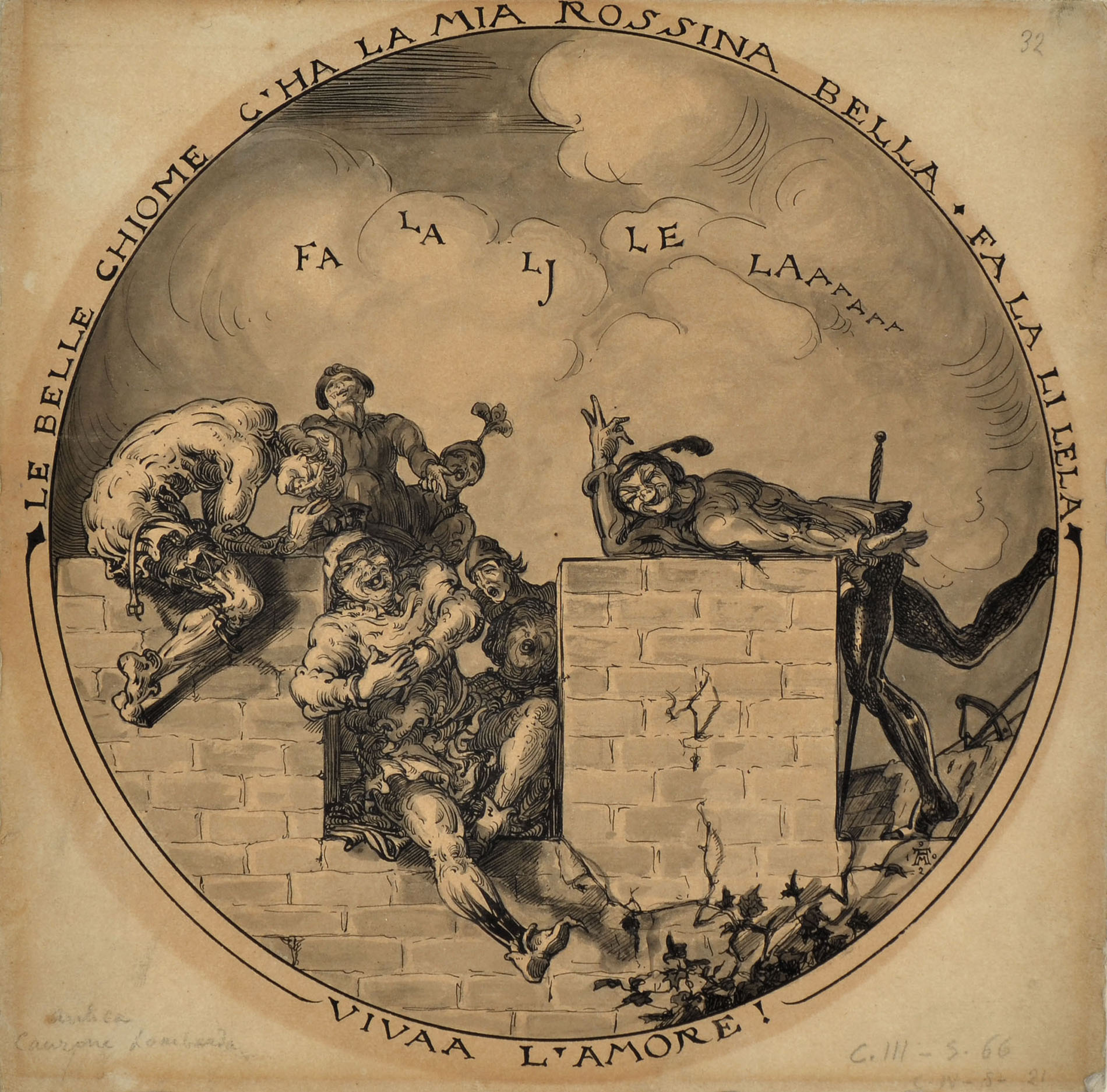 Pen with black ink, washed in gray. Inscribed in pen LE BELLE CHIOME C'HA LA MIA ROSSINA BELLA * FA LA LI LELA * VIVAA L 'AMORE / FA LA LJ LE LAAAAAA (sic). Signed and dated with the monogram bottom right AM 1902.  199 x 201 mm.