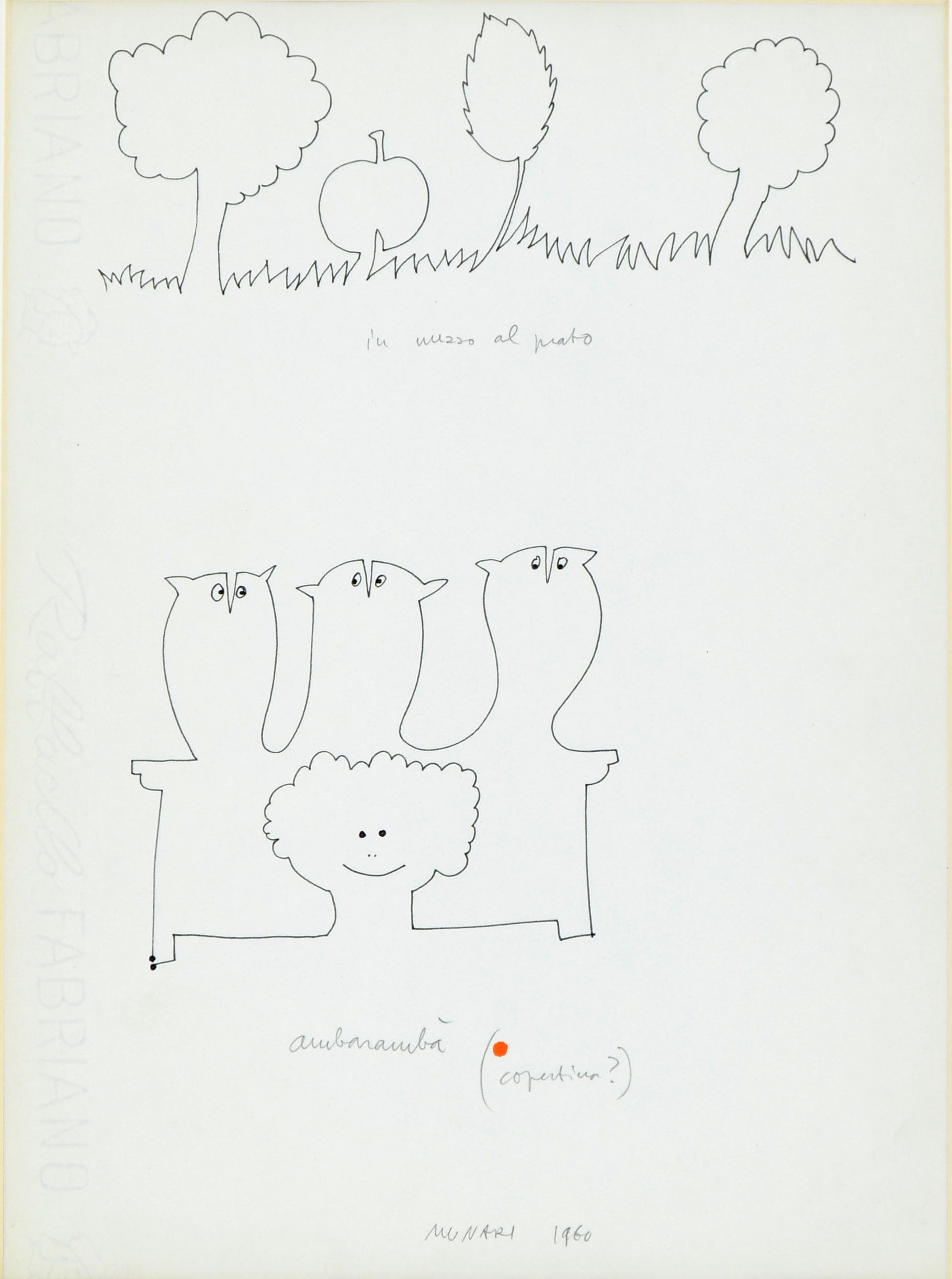 Pen and black ink on wove Fabriano paper. Titled and signed in pencil in mezzo al prato / ambarambà (copertina?) MUNARI 1960. 325 X 240 mm.