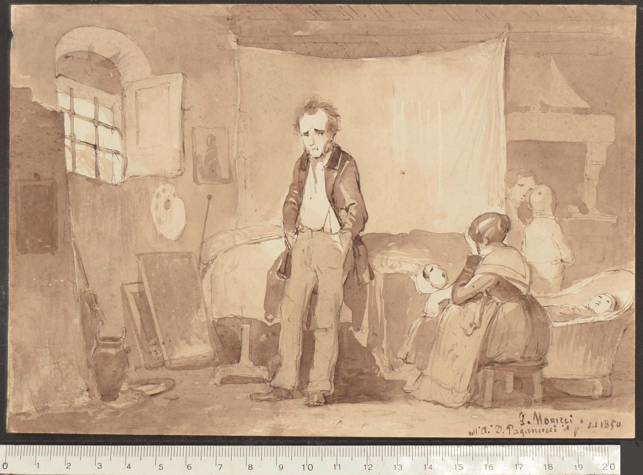 Pen and brown ink, washed in brown, over traces of black chalk. Signed, dedicated and dated G. Moricci /all'A°. D. Paganucci / p° del 1850. 142 x 206 mm.