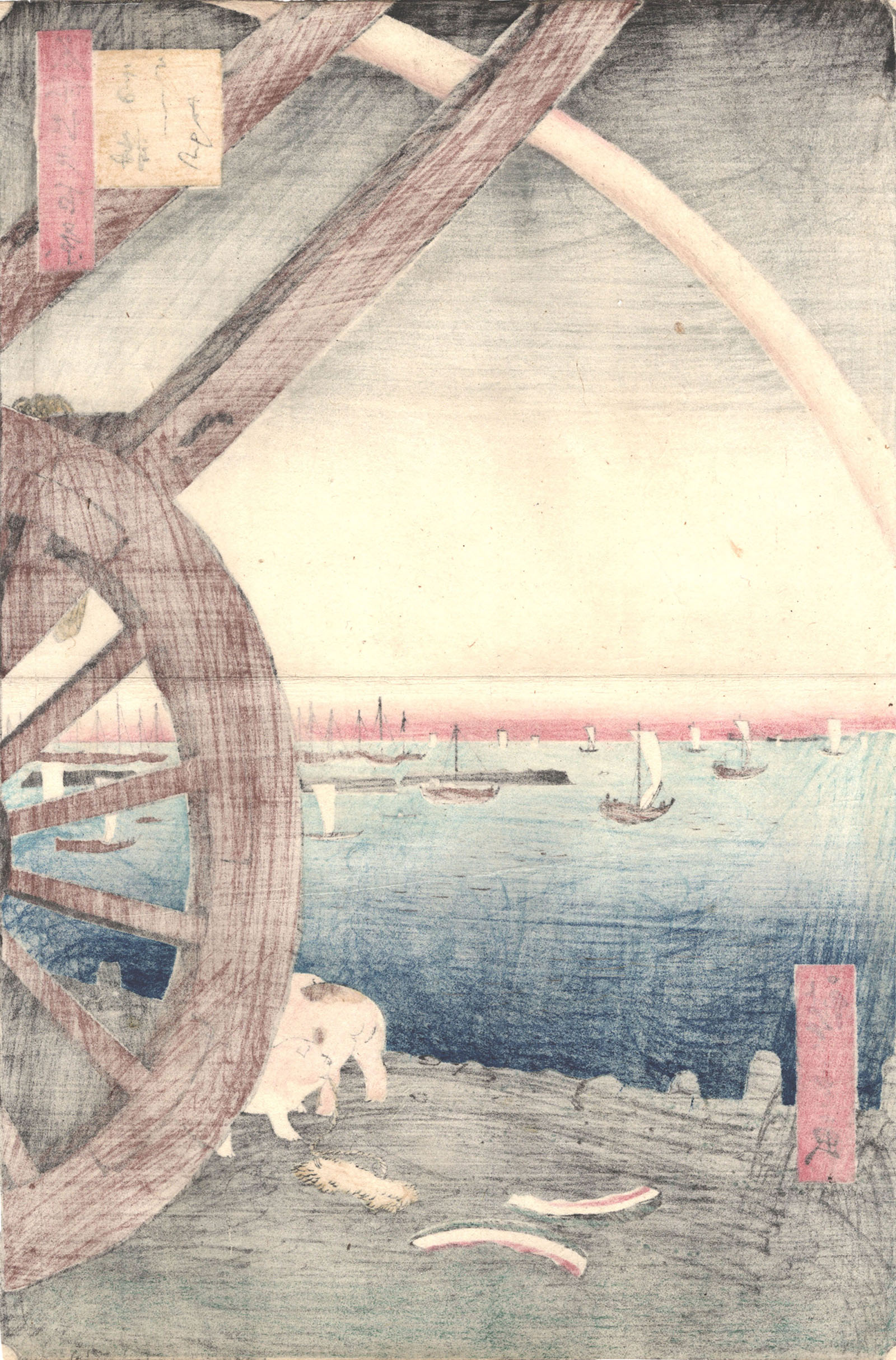 Colour woodblock print, 1857, from the series in vertical oban format One Hundred Famous Views of Edo. Signed Hiroshige ga. Censor's seals: cut off of this impression. Sheet trimmed to the subject. Trace of horizontal crease in the center.