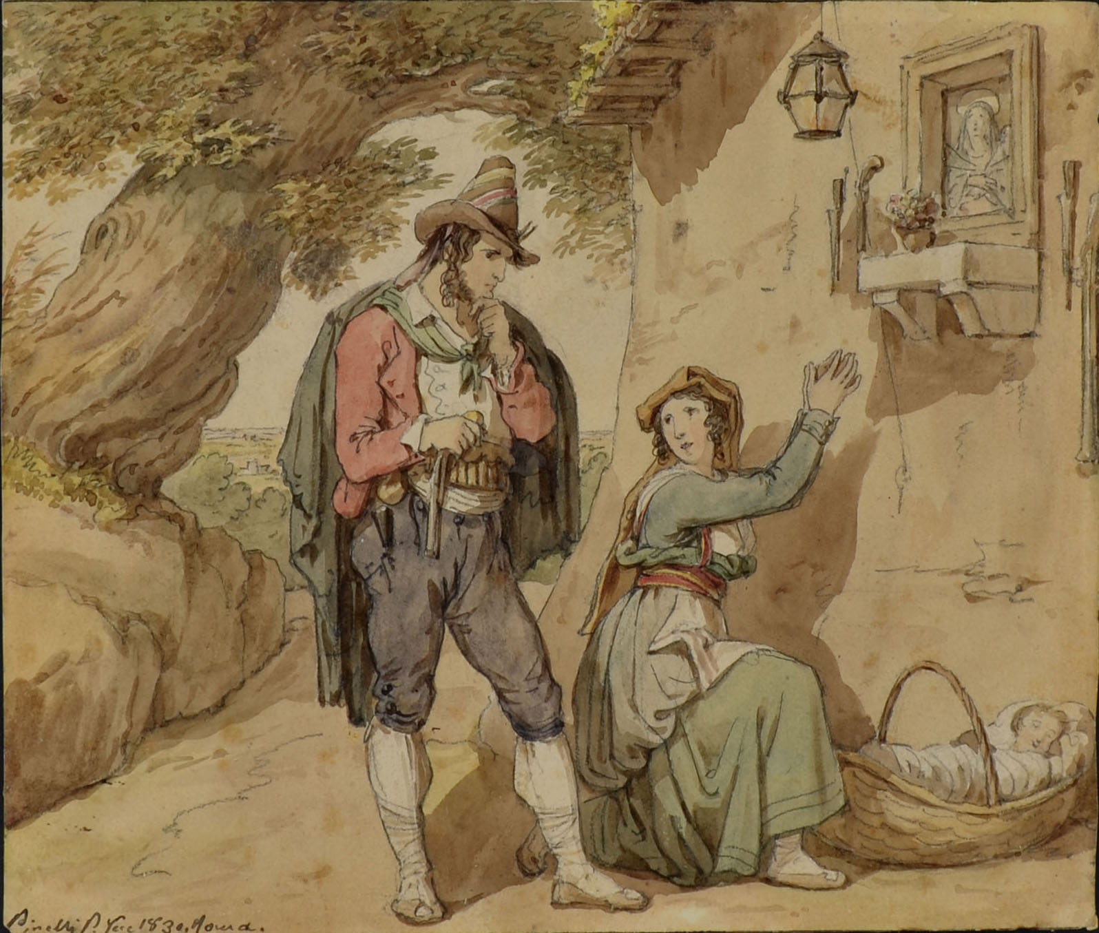 Watercolour. Signed, dated and located in pen bottom left Pinelli. P. (padre) fece 1830. Roma. Inscribed Pinelli on the verso.