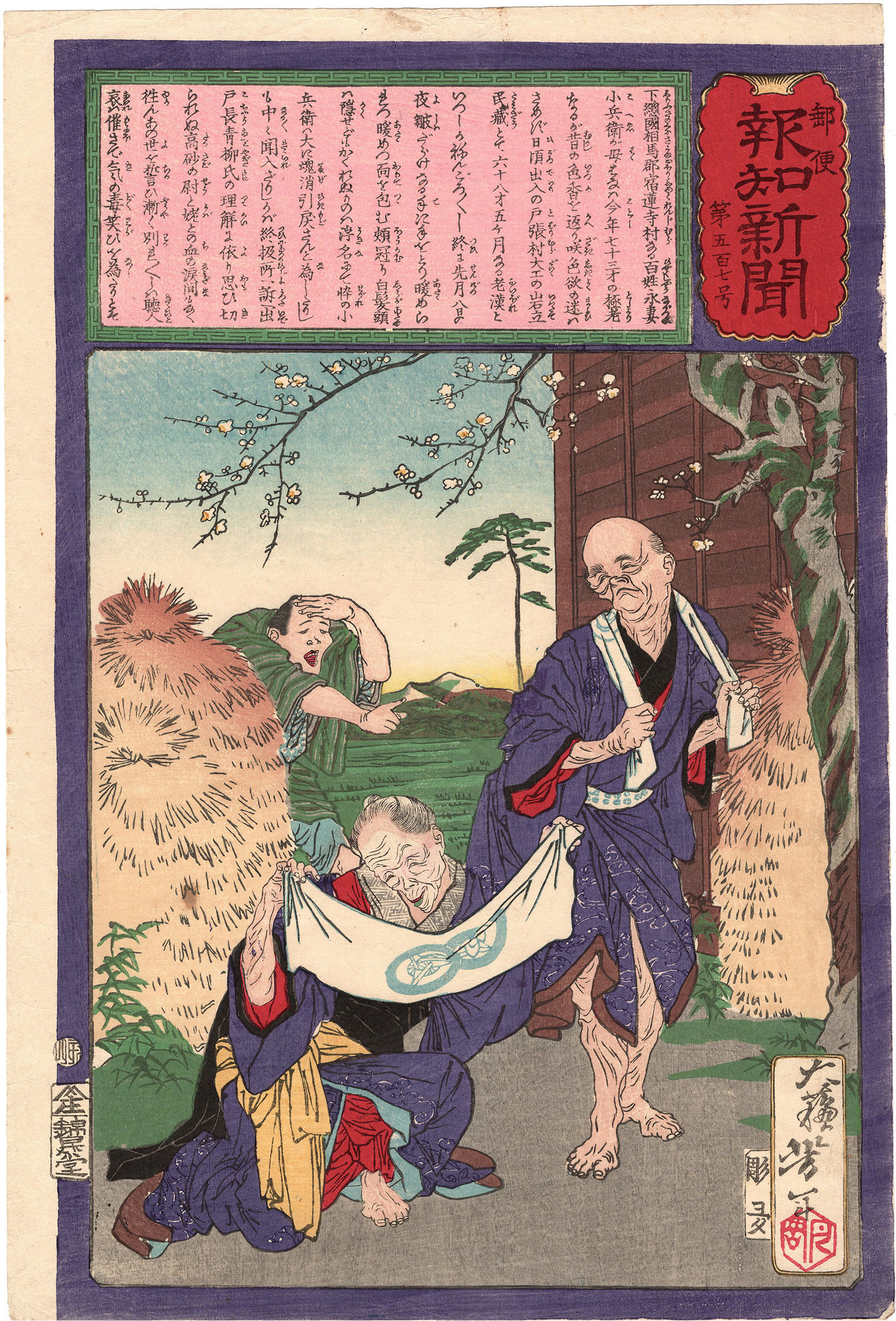 Colour woodblock print, published for the newspaper Yûbin hôchi shinbun. This print published in 1875. Signed Taiso Yoshitoshi, red artist’s seal.