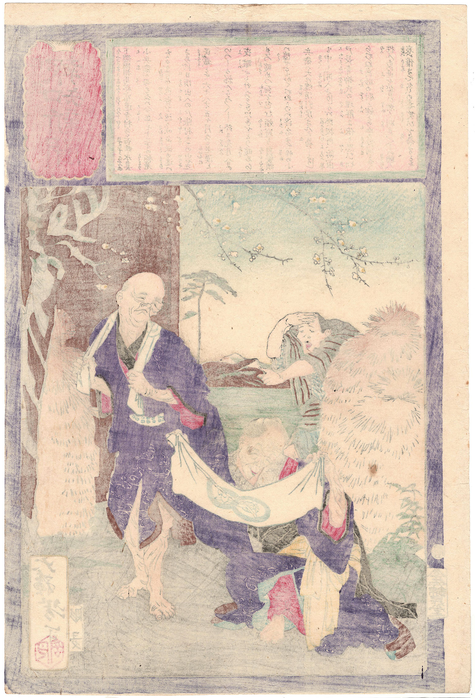 Yoshitoshi was one of the last great masters, and one of the great innovative and creative geniuses, of the Japanese woodblock print. At the age of eleven, he was enrolled as a student of the school of Kuniyoshi. His early work is full of extremely graphic violence and death, perhaps mirroring the lawlessness and violence of Japan around him, which was simultaneously going through the breakdown of the feudal system imposed by the Tokugawa shoguns, as well as the impact of the West. By 1871, Yoshitoshi became severely depressed. Unable to work, he hardly produced any prints for two years. In 1873 he recovered from his depression and changed his name to Taiso, which means great resurrection. In 1882 he was employed by a newspaper. This gave him a steady income and marked the end of years of poverty. His last years were among his most productive, not only in terms of quantity, but also in terms of artistic quality. In 1885 the first designs of One Hundred Aspects of the Moon were published. This series was extremely popular. In 1888 the series 32 Aspects of Customs and Manners was published, a series of women's prints. In 1889 a new series with ghost subjects came on the market: New Form of 36 Ghosts. The symptoms of mental illness became more and more frequent. Nevertheless Yoshitoshi continued to work. He died in 1892 from a cerebral hemorrhage at the age of 53.