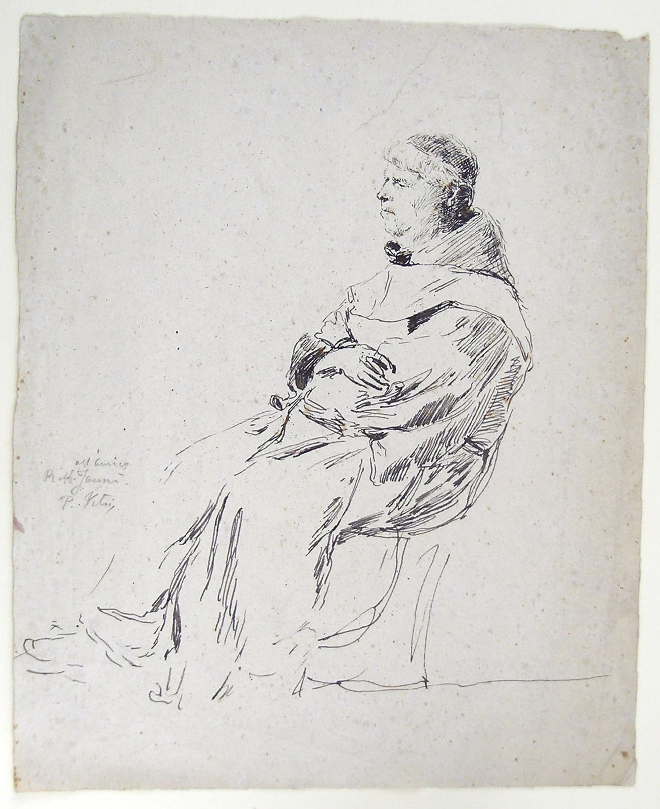 Pen and black ink on laid paper; signed and dedicated 'All'amico / Prof. Janni / P. Vetri'; 333 x 270 mm.