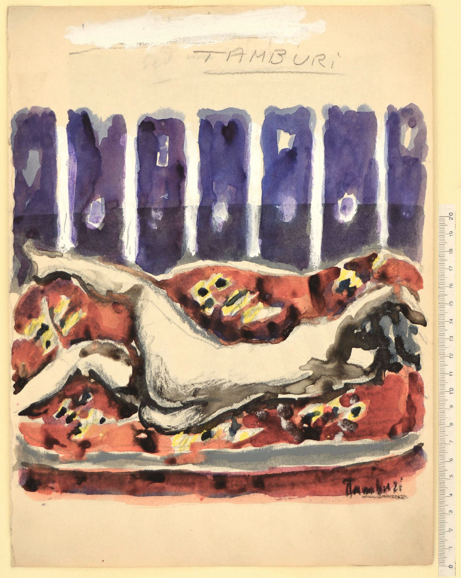 Pastels and watercolours, inscribed at top TAMBURI, signed in black chalk OTamburi; 320 x 241 mm. The subject of the drawing is the same of a print executed by Tamburi in 1961, inspired by Baudelaire's poem.