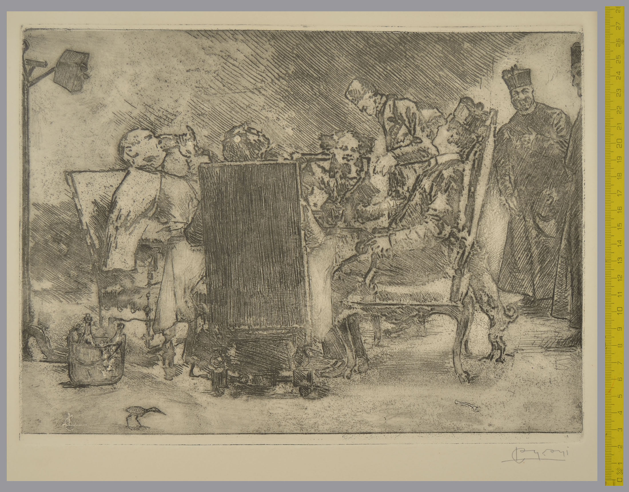 Conconi was commissioned by the magazine Cronaca d'Arte to execute caricatural illustrations to the comedy by Luigi Illica La Sottoprefettura di Rogagnecca, a satire on the relationship between politics and the Church. This print represents a convivial scene of the second act.