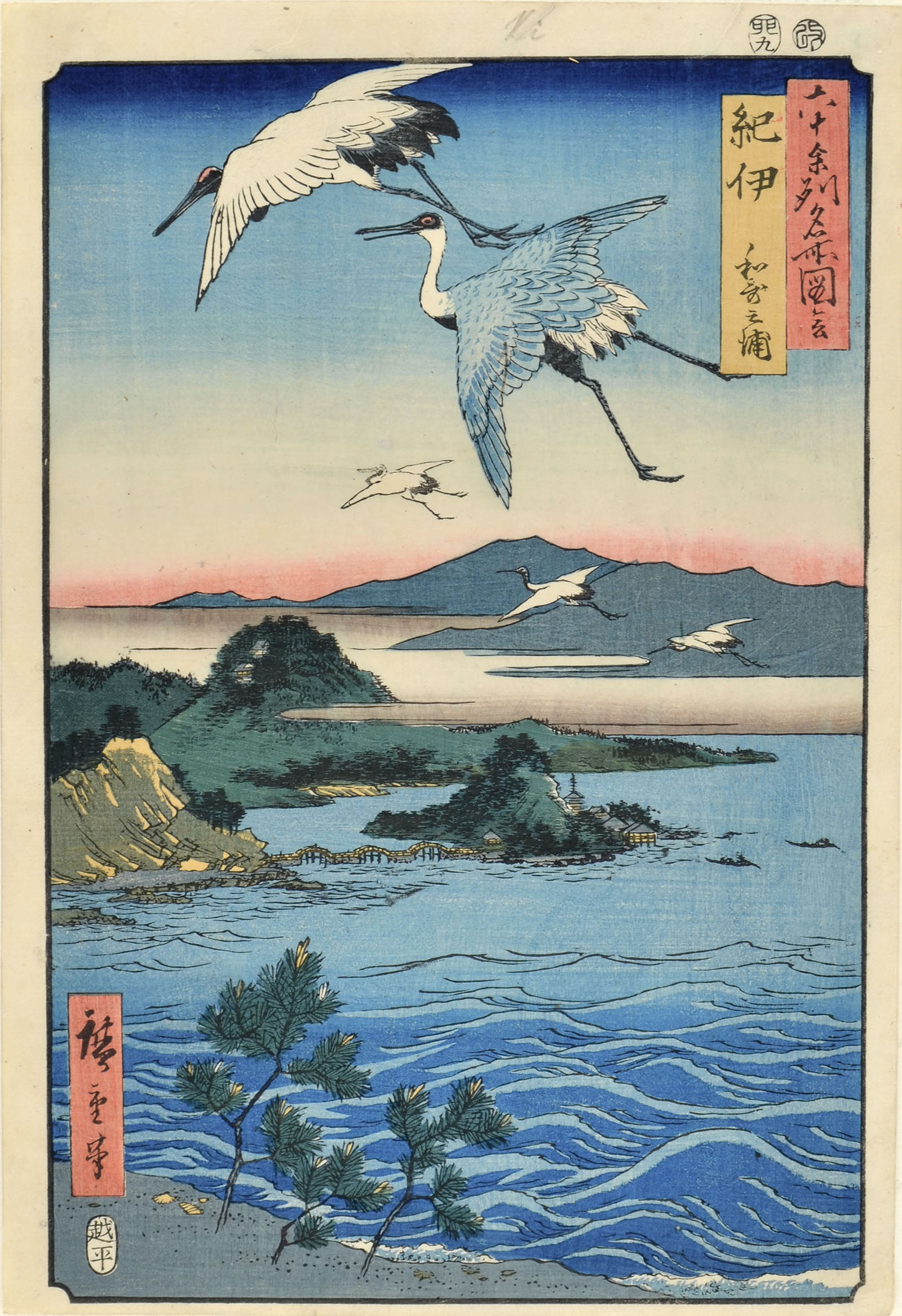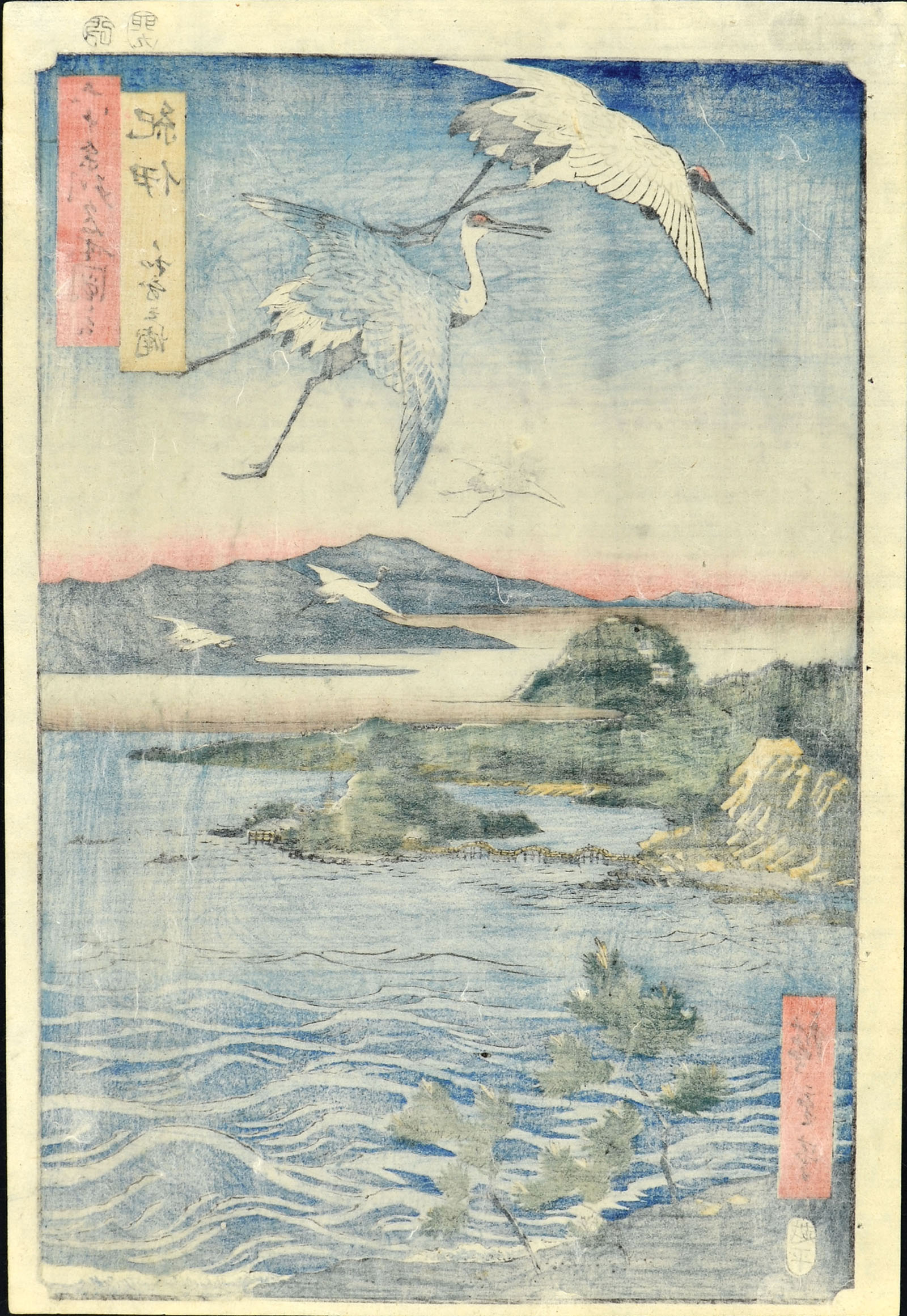 Fine impression, colour and condition. The plumage of the highest-flying heron is made with dry printing (karazuri).