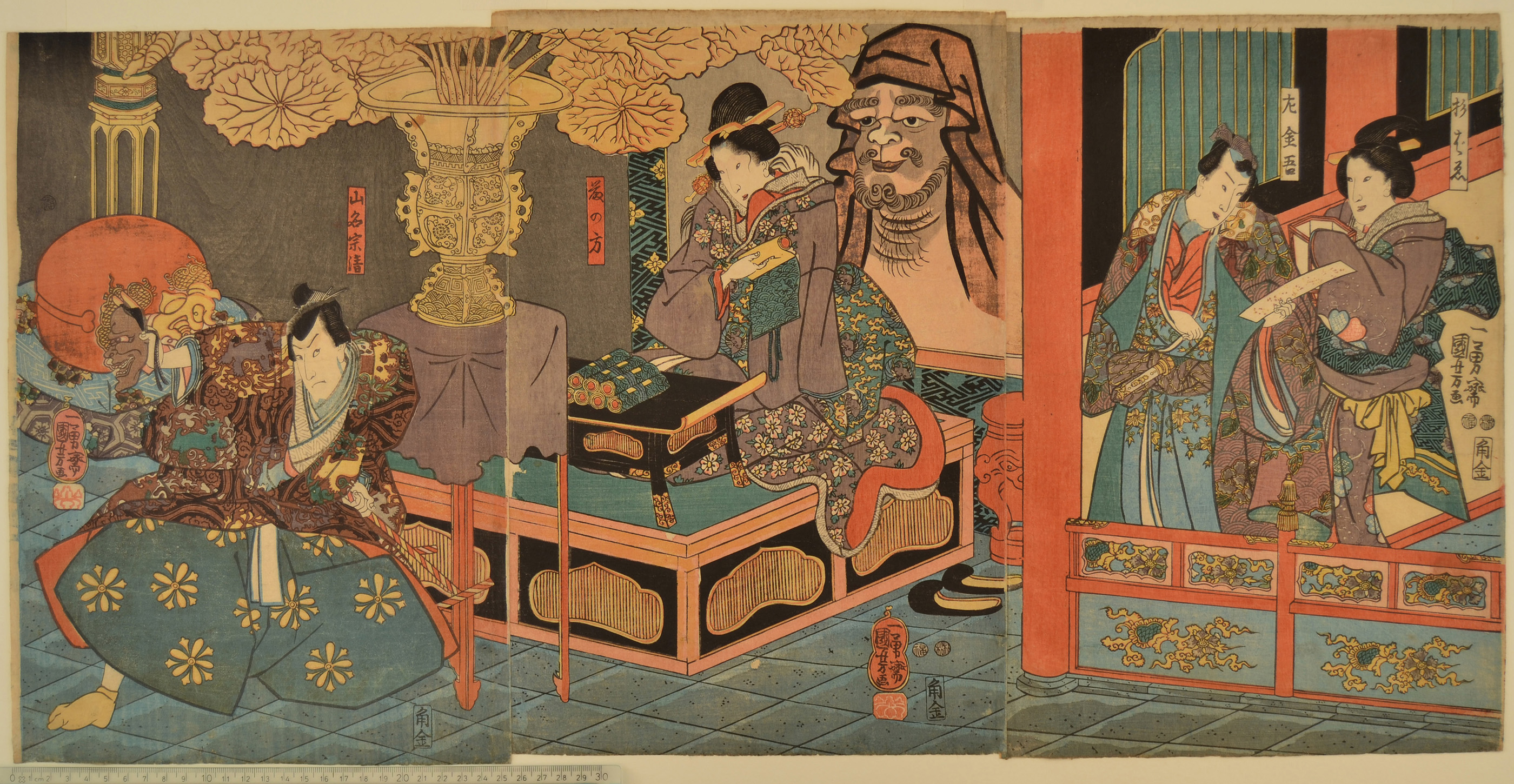 Apparently a quite rare triptych. I was not able to find any impression of any of the three sheets in books or on the web. I only found two triptychs by Kunisada depicting scenes of the same play, at the Minneapolis Institute of Art: inv. 96.146.104.4A,B and 96.146.104.5A-C