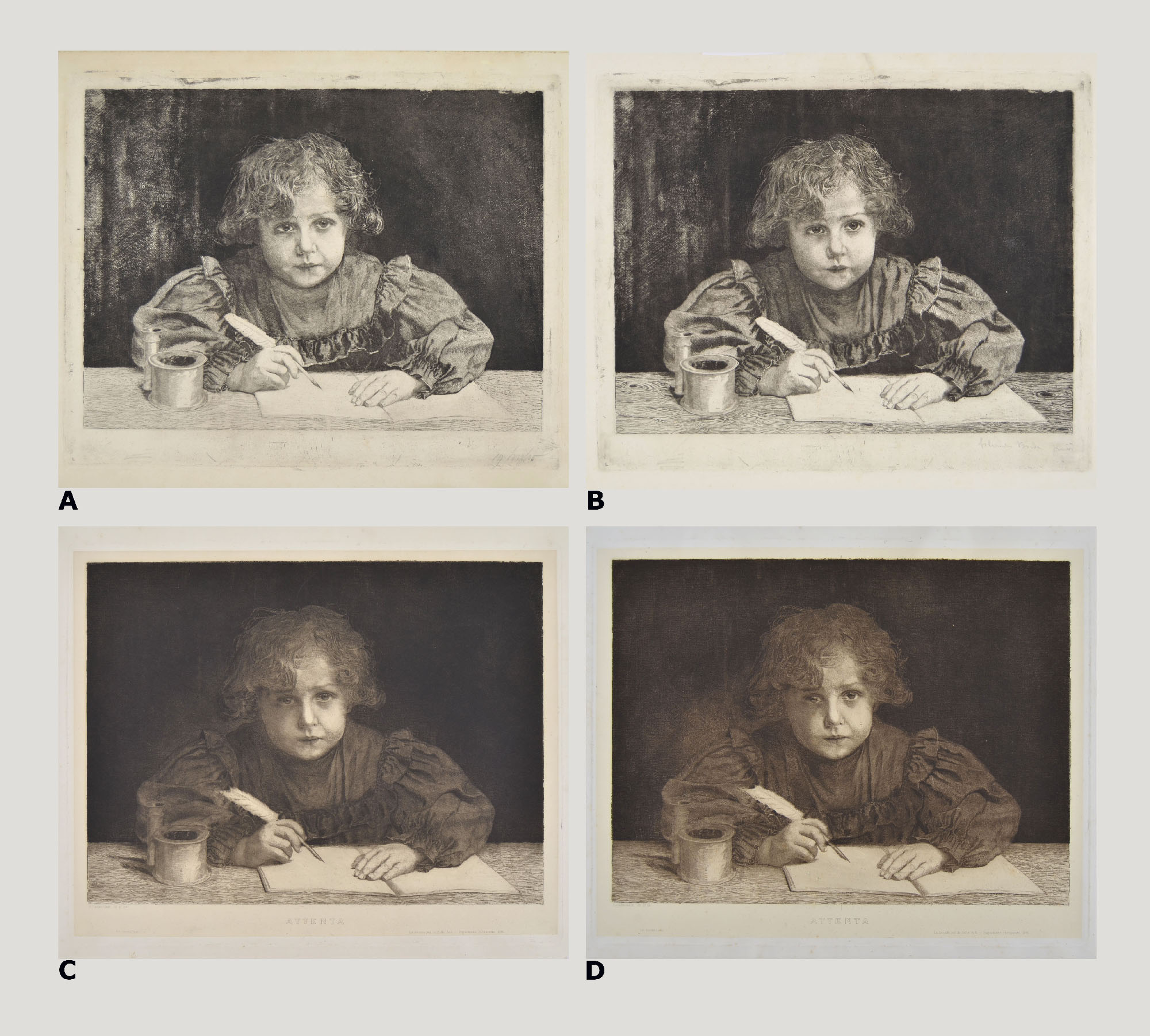 C: final state, with letters: F. COLOMBI-BORDE DIS ED INC. / Calc. Gastaldi Torino / ATTENTA / La Società per le Belle Arti - Esposizione Permanente 1898. Printed in black ink on chine appliqué on thick wove paper. To the platemark 364 x 448 mm, the entire sheet measuring 475 x 695 mm.