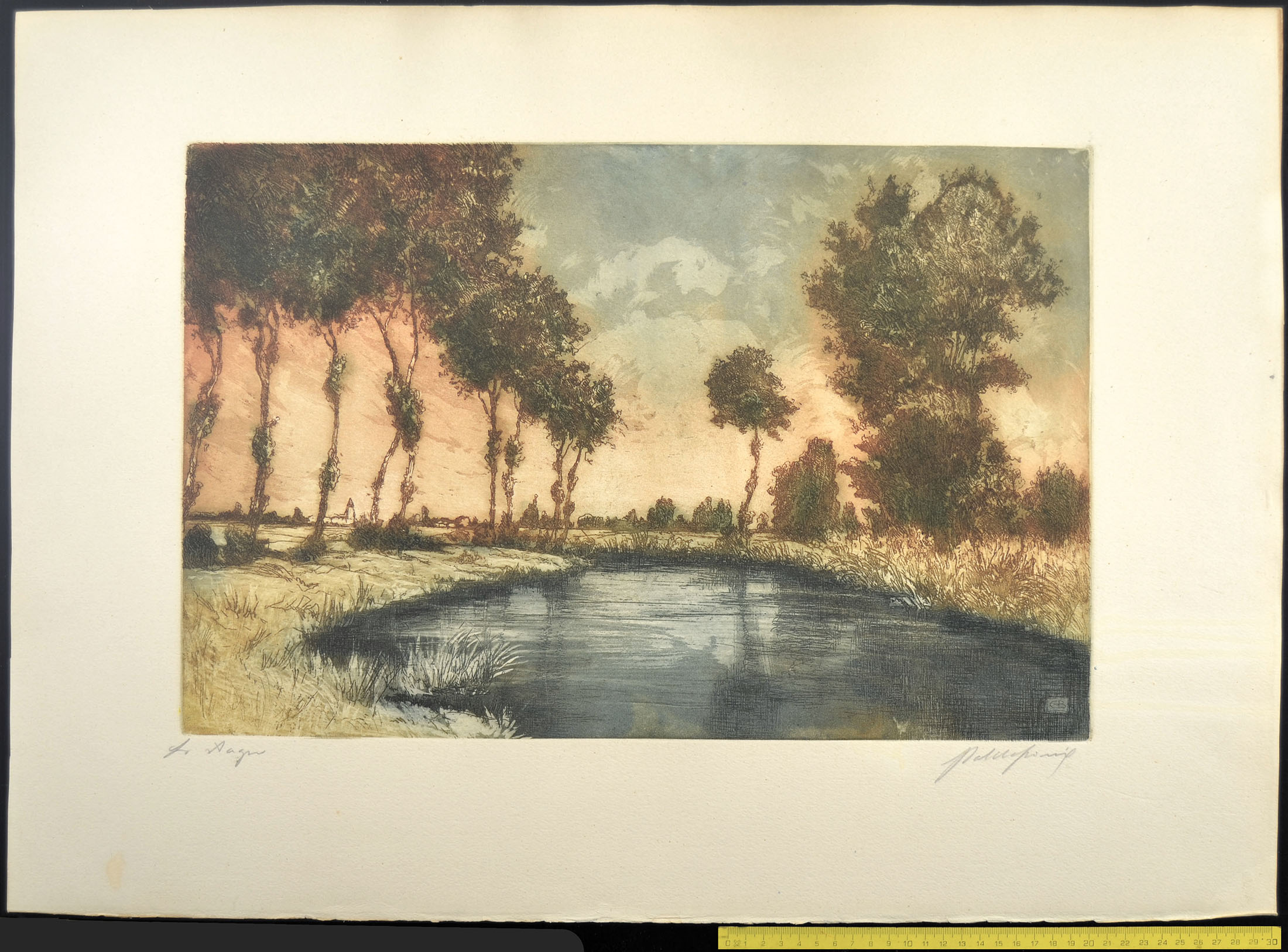Etching, printed in colours. Signed in the plate GB. Titled and signed in pencil at bottom Lo stagno Baldassini.