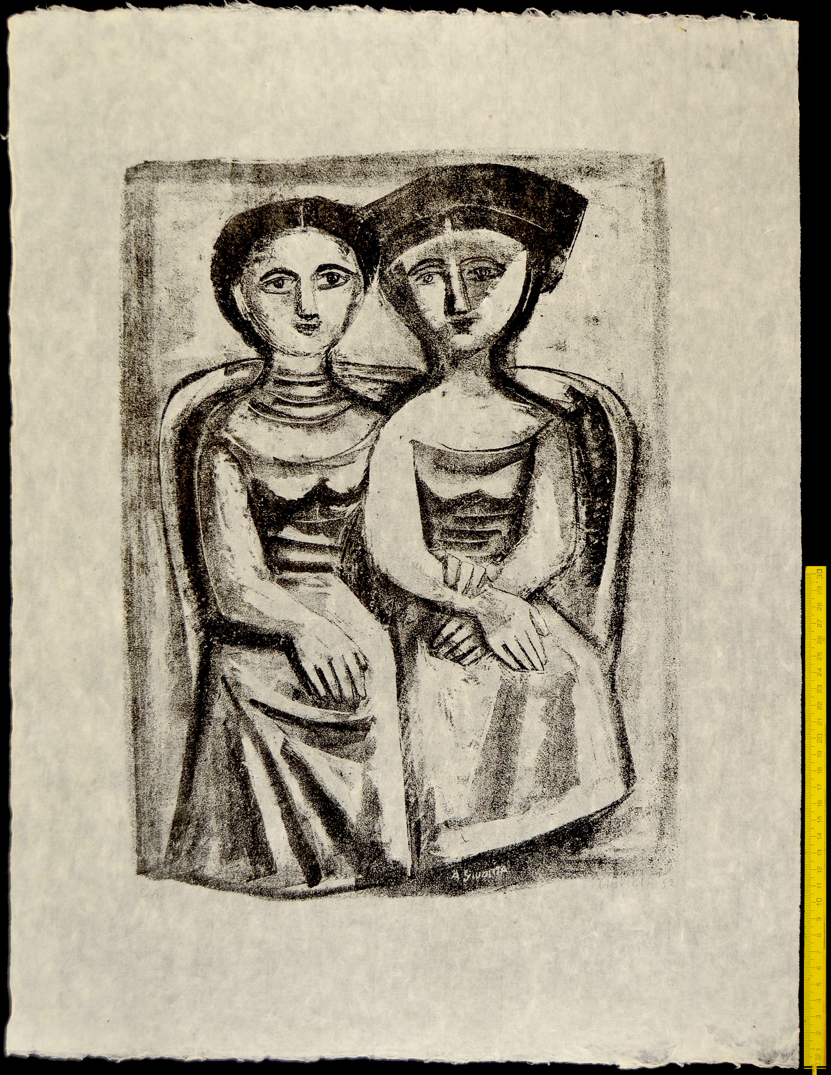 From the set of ten Campigli La Ruche, Published by N.R.F. in Paris, 1952, printed by il Cavallino, Venice. The edition was 125 on FABRIANO paper. Our impression is one of the few artist’s proofs and is pulled on thin Japanese paper, inscribed, signed and dated in pencil at bottom E.A. / CAMPIGLI 52.