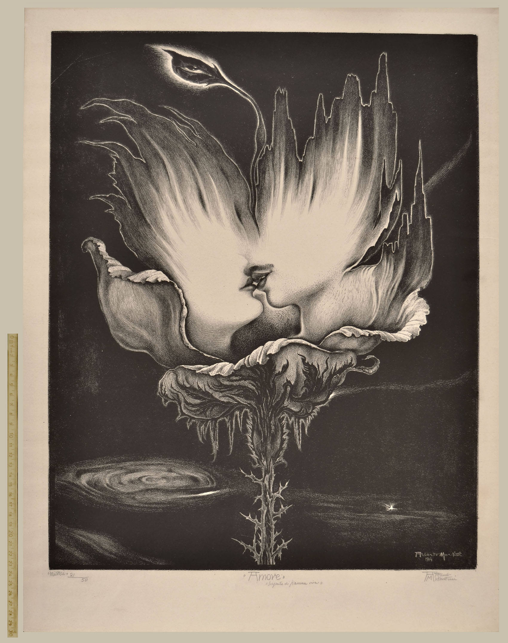 Lithograph, 1914, Meloni 11. From the series of 6 lithographs Misteri. Signed and dated in the stone Alberto Martini / 1914. Titled, numbered and signed in pencil at bottom: " Misteri" / 21/50 / "Amore" / "Sorgente di fiamma viva" / AM / Alberto Martini. On wove paper, in good condition. To the image 544 x 434 mm, the entire sheet measuring 636 x 483 mm.