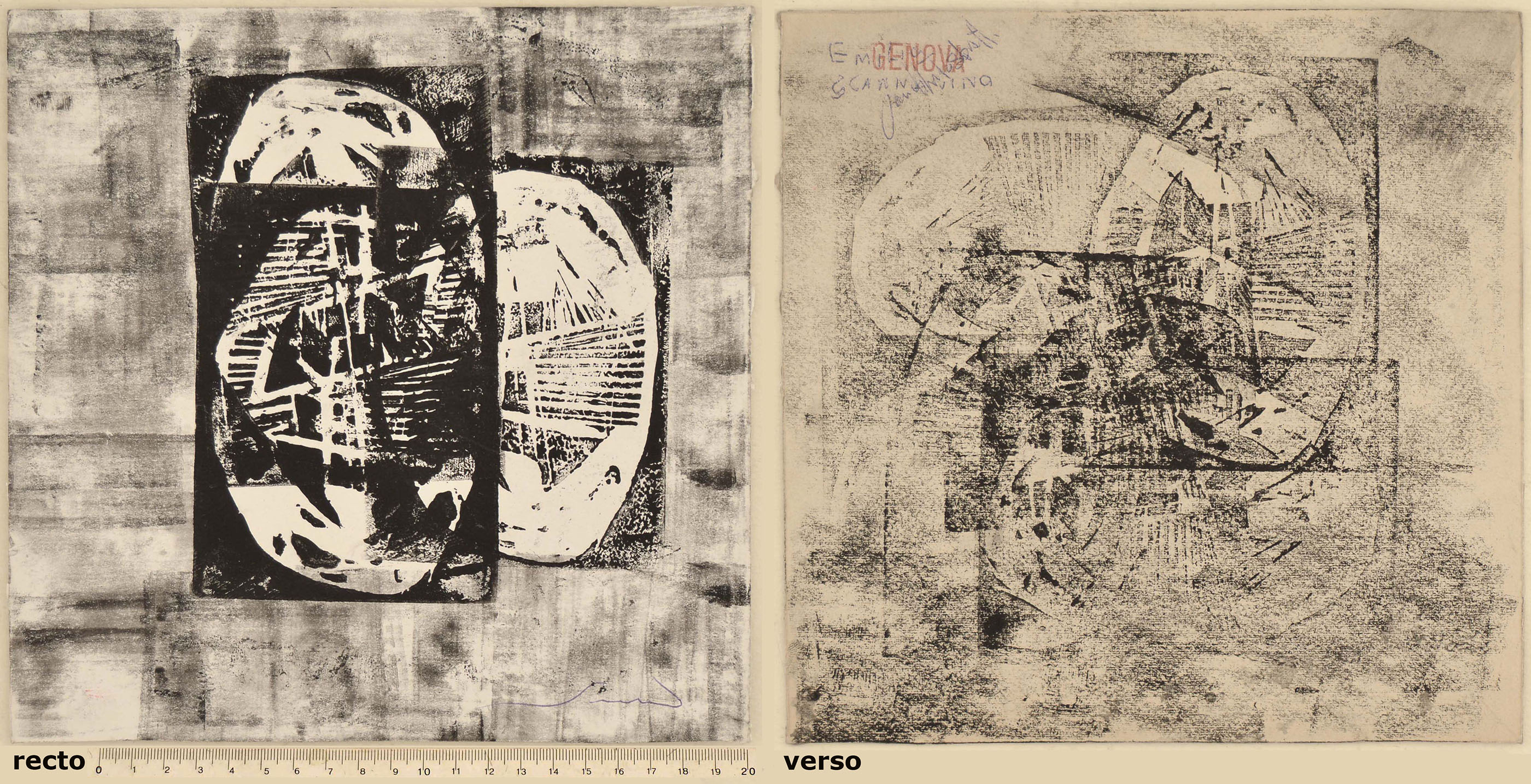 On the recto as on the verso, the artist used a black inked matrix to impress three overlapping shapes on a prepared background.
