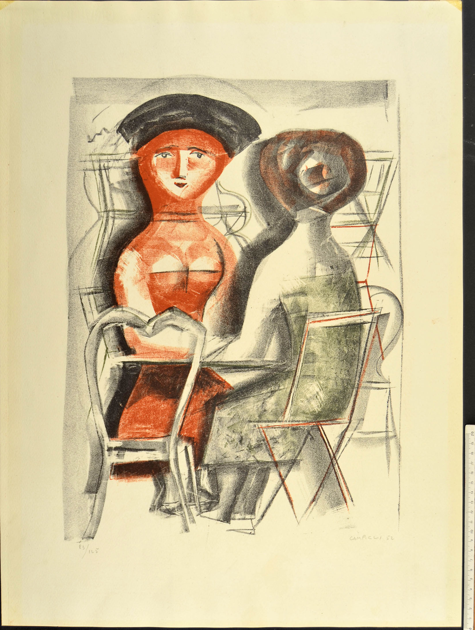 Colour lithograph (ocher, green, brown, black) 1952, Meloni-Tavola 132. The lithograph was conceived for the set Campigli La Ruche, Published by N.R.F. in Paris, 1952, printed by il Cavallino, Venice.