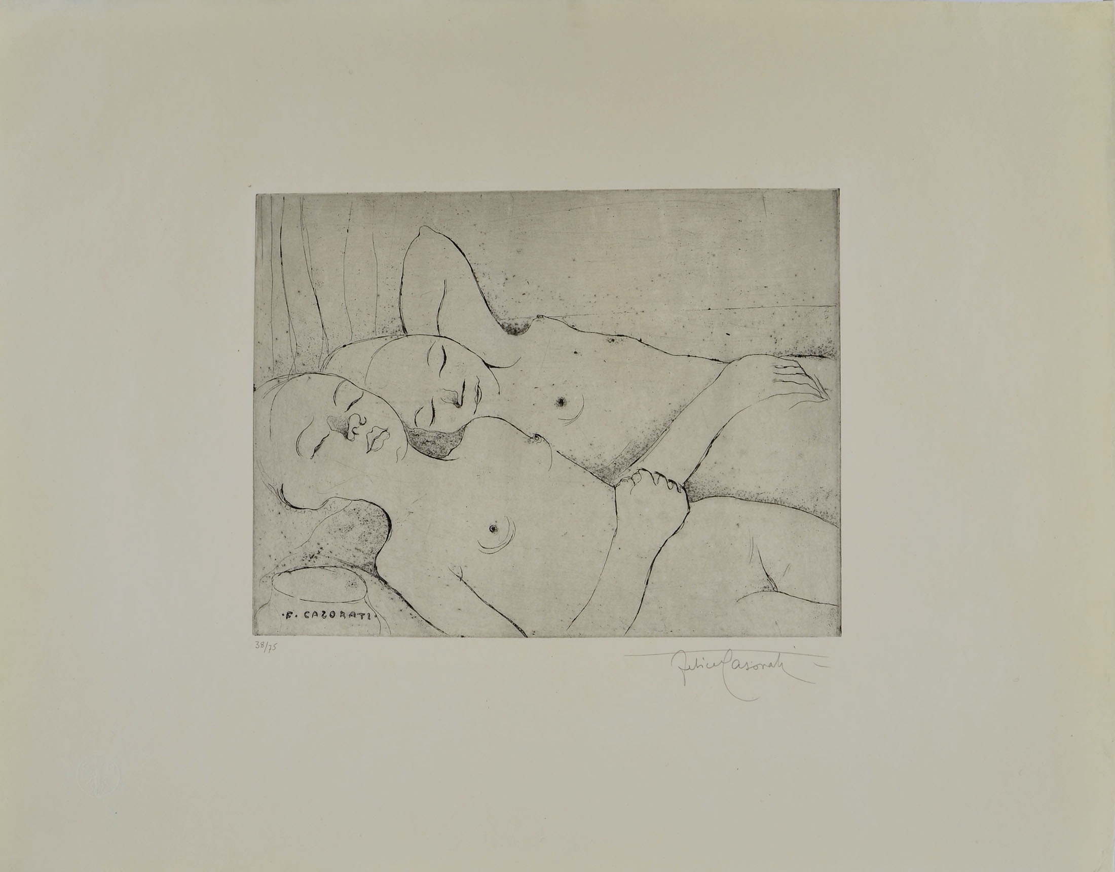 Etching and drypoint, signed in the plate F. CASORATI, numbered and signed in pencil at the lower margin 38/75 / Felice Casorati; a fine impression on simili Japon. Full margins, evenly toned, otherwise in very good condition. To the platemark 245 x 326 mm, the entire sheet measuring 498 x 635 mm.