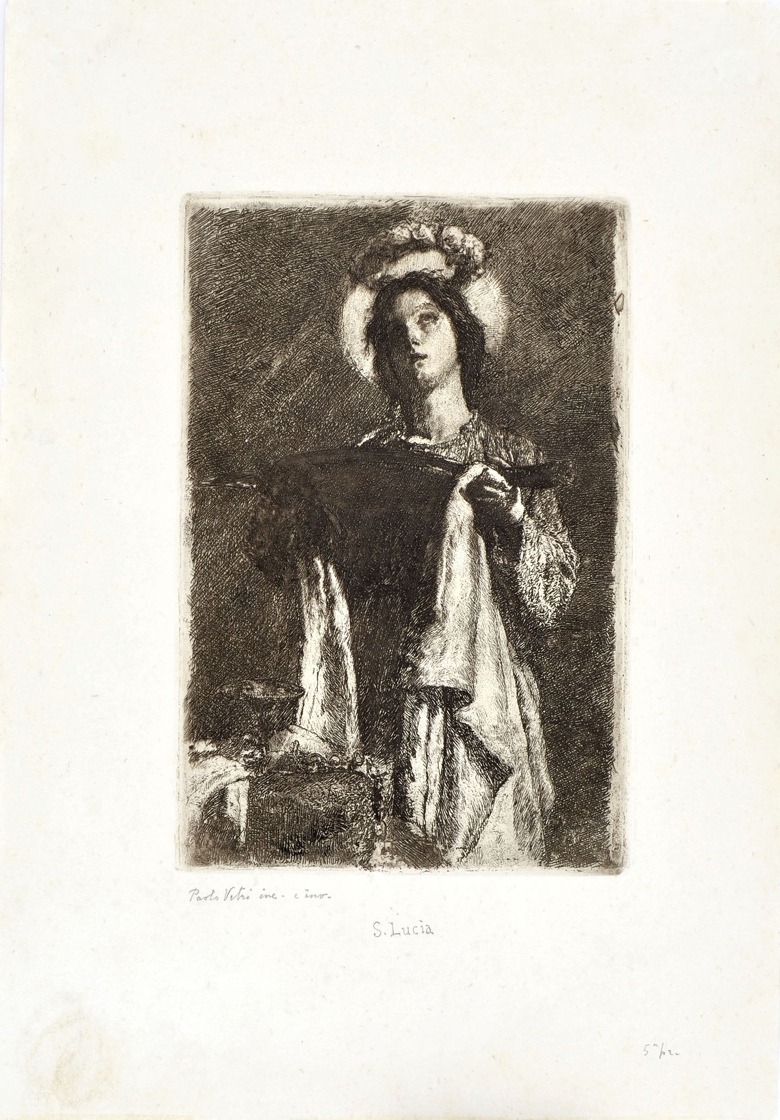 Etching. Signed, titled and numbered in pencil bottom margin Paolo Vetri inc. e inv. / S. Lucia / 5a pr. To the platemark 236 x 155 mm, the full sheet 396 x 273.
