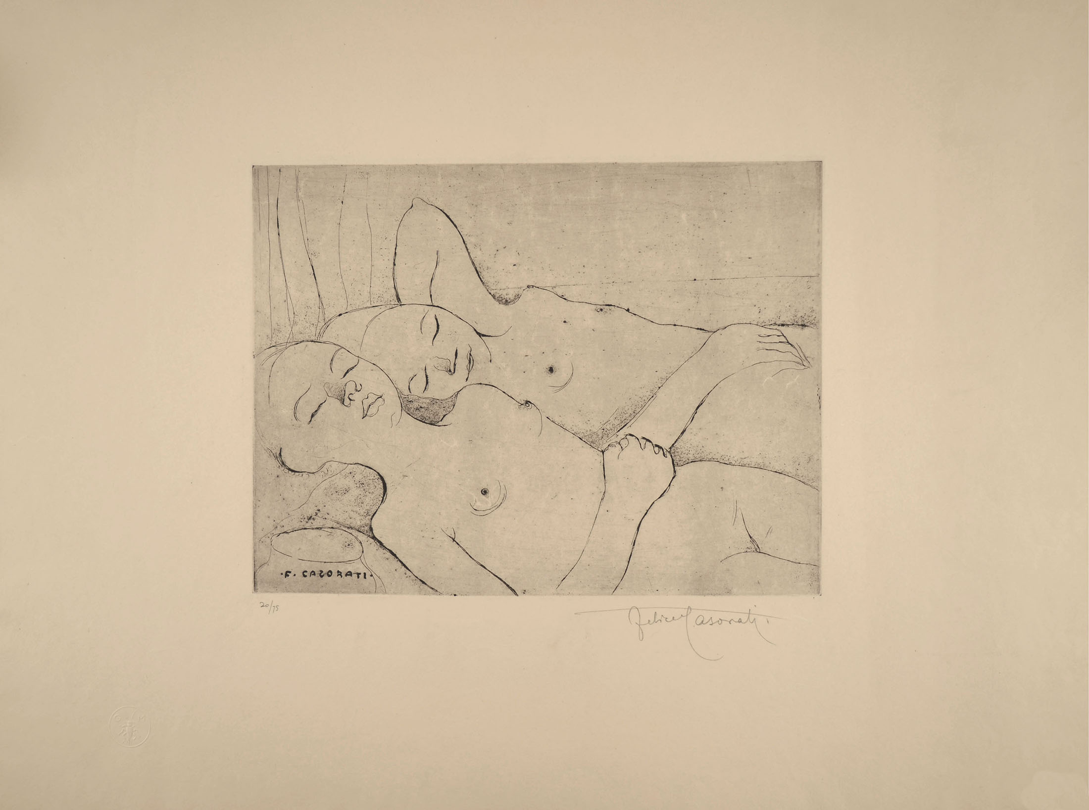 Etching and drypoint, signed in the plate F. CASORATI, numbered and signed in pencil at the bottom margin 20/75 / Felice Casorati; a fine impression on simili Japon. Full margins, in very good condition. To the platemark 244 x 324 mm, the entire sheet measuring 490 x 643 mm.