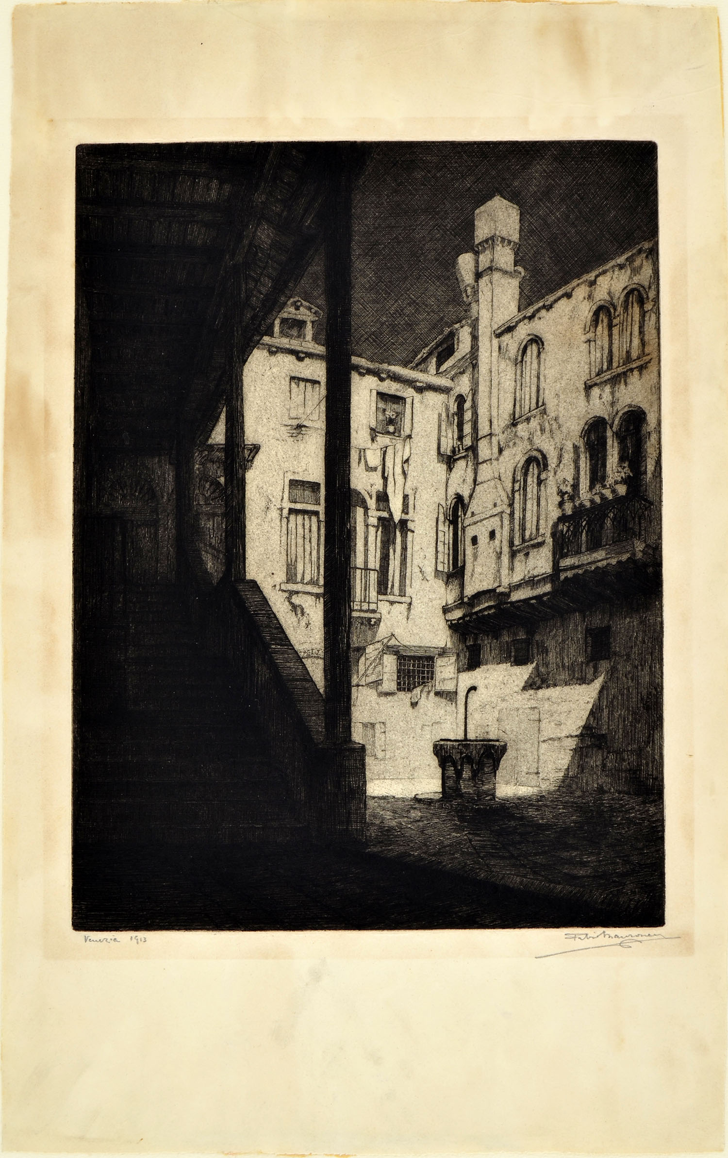 Etching, a rich impression of the first state of two, with margins. Titled, dated and signed in pencil bottom margin Venezia 1913 / Fabio Mauroner.