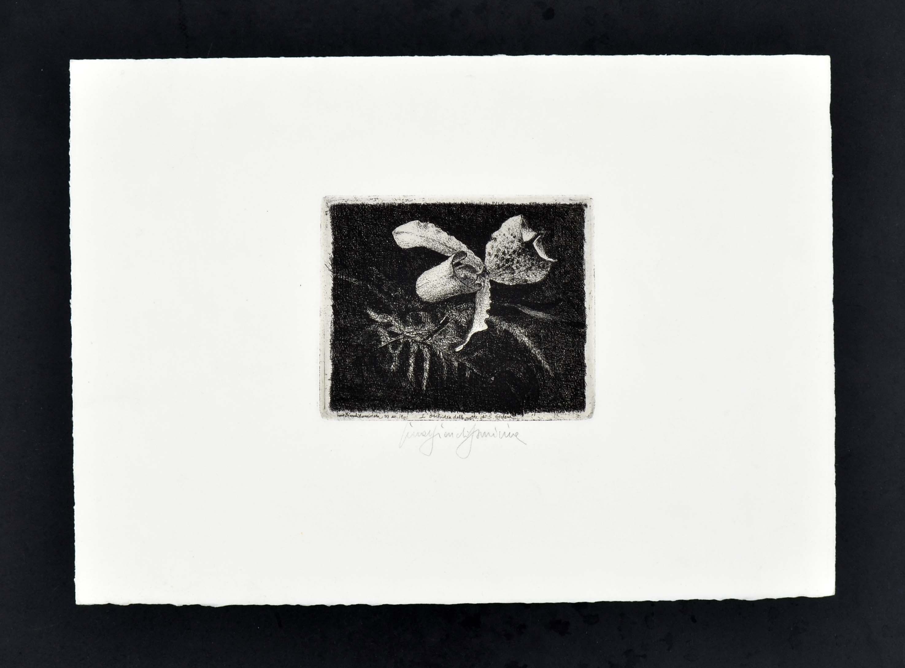 Fifth state of five. Titled, signed and dated in the plate at bottom Lino Bianchi Barriviera 1941 - 27 dic. L'orchidea della notte di S. Stefano, signed in pencil bottom margin Lino Bianchi Barriviera. On paper with watermark GRAPHIA. To the platemark 101 x 123 mm, the full sheet 249 x 346