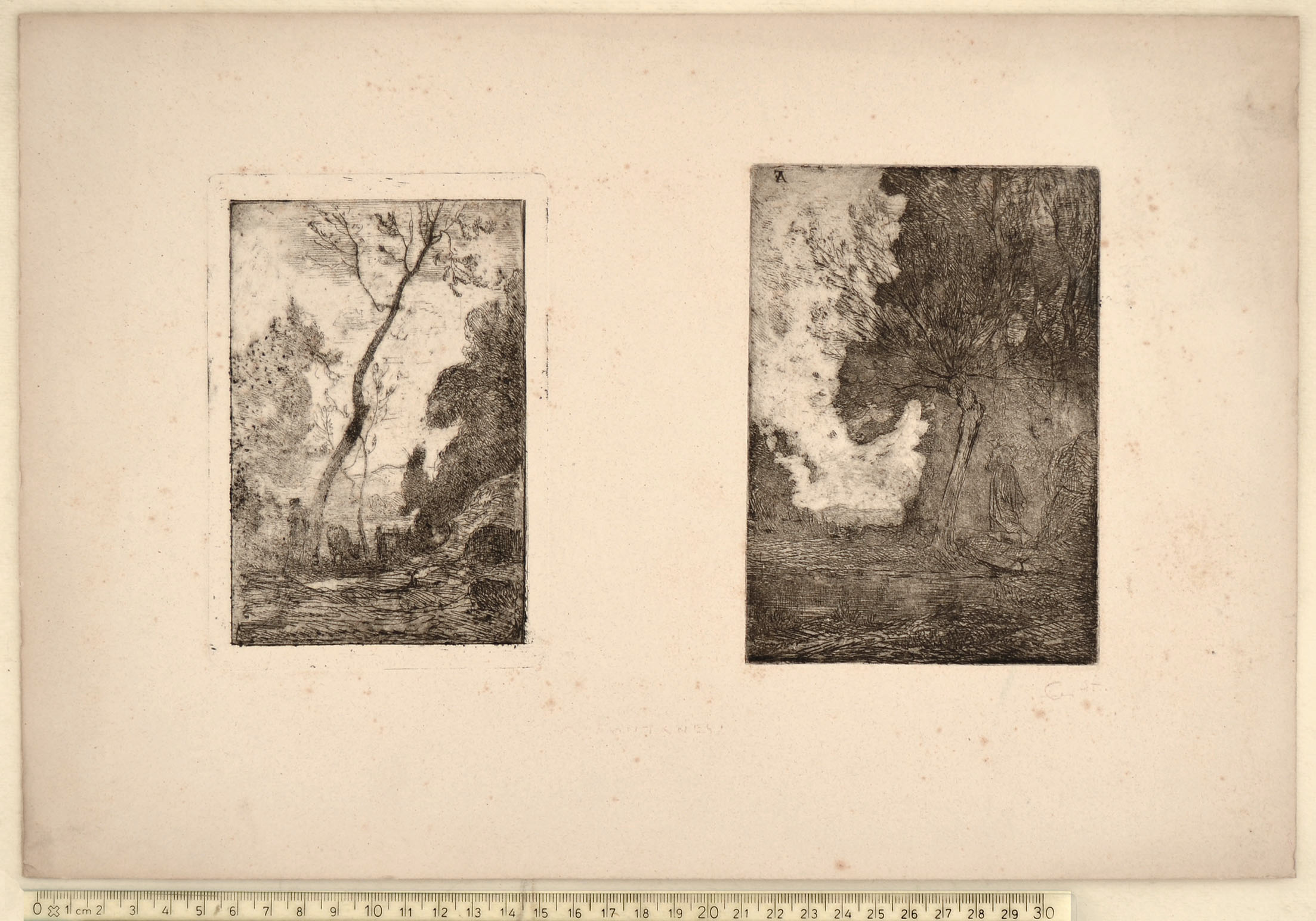 A pair of etchings printed on one sheet of ivory thick and soft wove paper. a) Dragone 58, second state of three, to the platemark 148 x 100 mm. b) Dragone 62, first state of two, to the platemark 148 x 104 mm. The sheet, measuring 258 x 380 mm, has been inscribed in red chalk at bottom center A. FONTANESI and at bottom right LC st. The inscription is surely by Luigi Conconi and demonstrates that the impressions were pulled by him. Inscriptions with the same type of red chalk, which tends to disappear, leaving a dry imprint on the paper, are found on Conconi's own etchings. To my knowledge this is the first evidence of a contact between the two artists as printmakers. Minimal foxing, otherwise in very good condition.