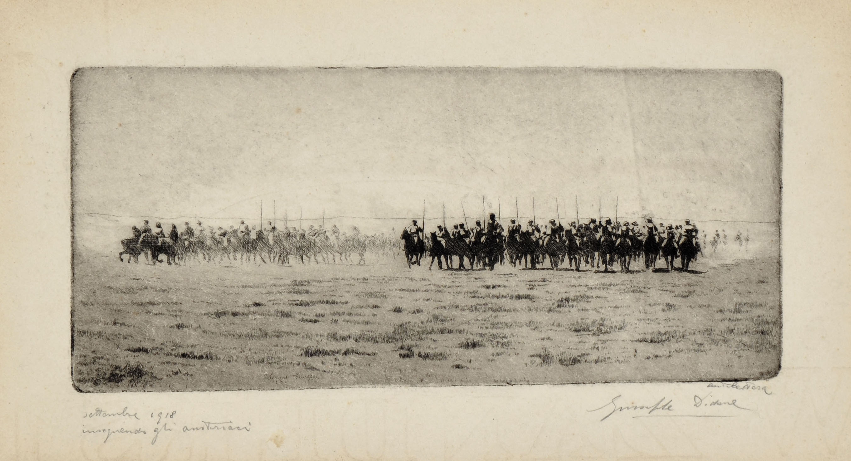 Etching, a fine impression, signed and dated in the plate Didone Giuseppe / 1934, titled and signed in pencil at the bottom settembre 1918 / inseguendo gli austriaci / antelettera / Giuseppe Didone. To the platemark 95 x 216 mm, the full sheet 165 x 285.