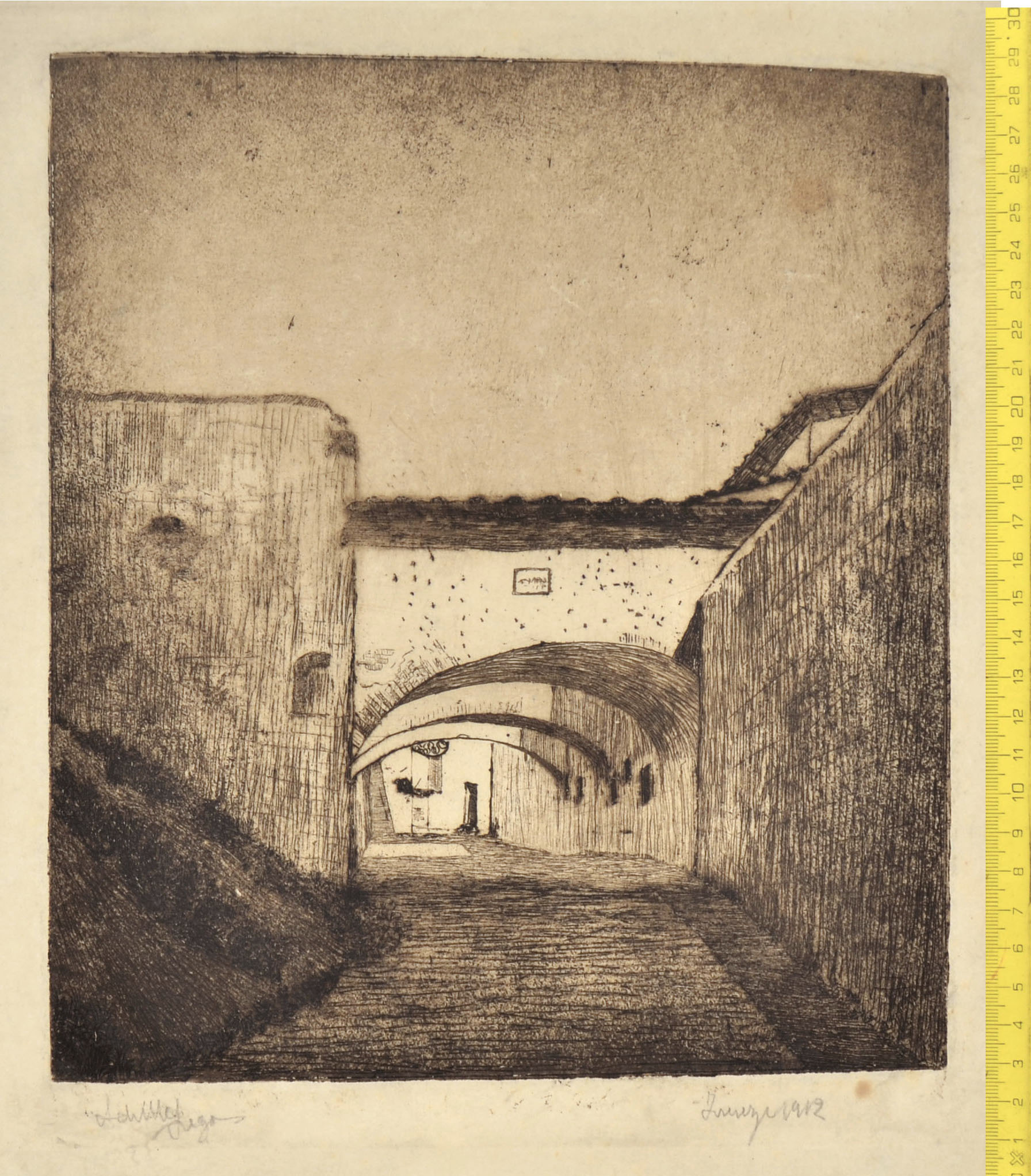 Etching. A fine impression on Japan, signed and dated in pencil Achille Lega / Firenze 1912. An extremely rare print, unknown to the catalog raissonné by Bartolini. To the plate mark 260 x 230 mm. The full sheet measuring 440 x 280.
