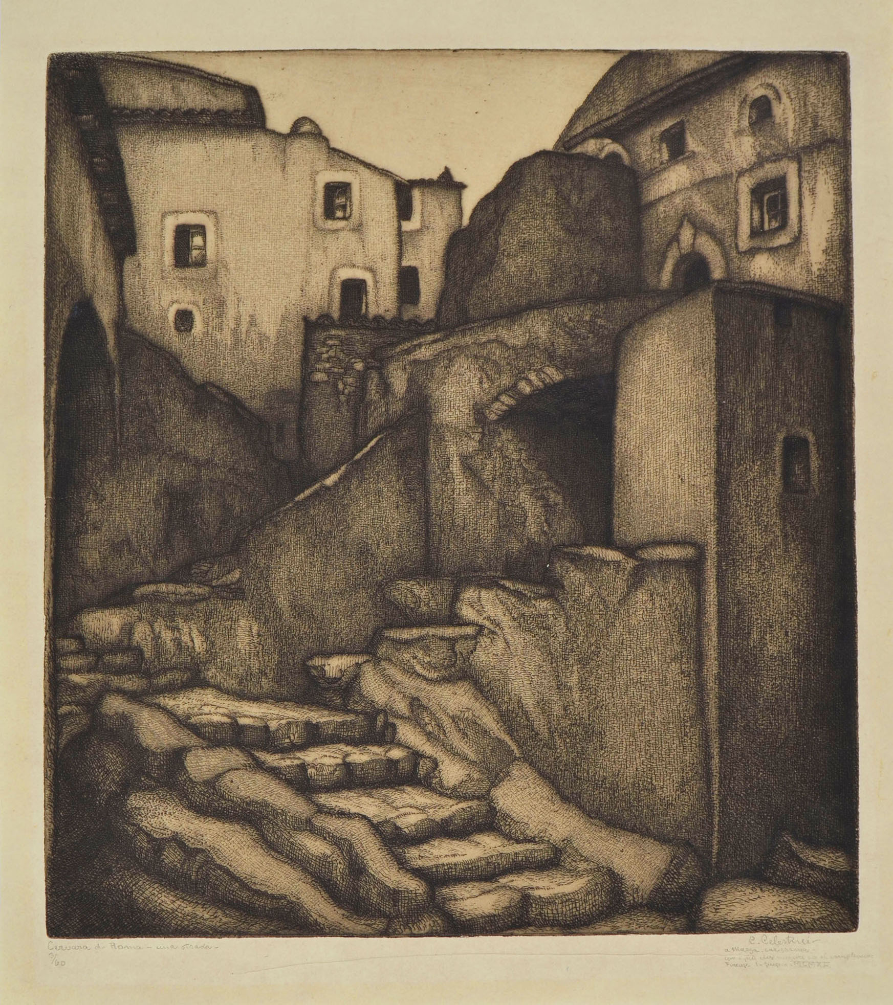 Fine impression printed on simili Japon paper.  Titled, numbered, signed, dedicated, located and dated in pencil bottom margin Cervara di Roma - una strada - / 3/60 / C. Celestini / a Marga, carissima / con i più vivi auguri per il compleanno / Firenze 1 - giugno - MCMXL. To the platemark 436 x 396, the full sheet measuring 509 x 444 mm.